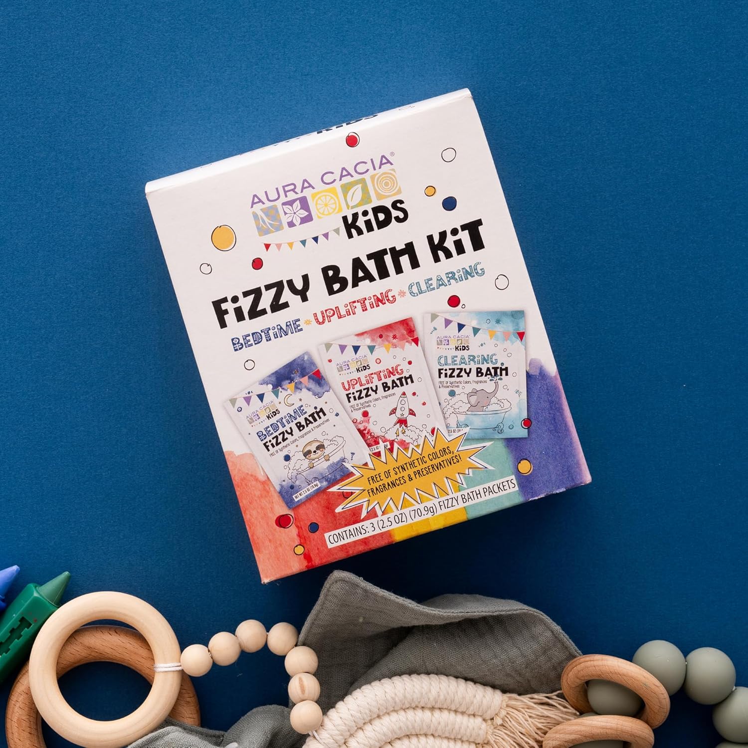 Aura Cacia Kids Fizzy Bath Kit,KIDS FIZZY BATH KIT - Includes Bedtime, Clearing, and Uplifting fizzy bath packets with pure essential oils, jojoba oil, and coconut-derived surfactants for soft, nourished skin,HOW TO USE - Choose from three blends to dissolve into running bath water for a fizzy, foamy bath experience without synthetic colors, fragrances, or preservatives,ETHICALLY MADE - Aura Cacia products are never tested on animals, and never contain synthetic colors or fragrances. All of our essential oils are GC/MS tested and are completely paraben and petroleum free,AURA CACIA'S PROMISE - When it comes to pure essential oils, it all begins at the botanical source. Aura Cacia is committed to delivering essential oils from all over the globe with integrity and botanical authority,ABOUT US - Aura Cacia was founded over 40 years ago on pure essential oils and true aromatherapy benefits. Most importantly, we're part of a member owned co-op that puts people and planet ahead of profits