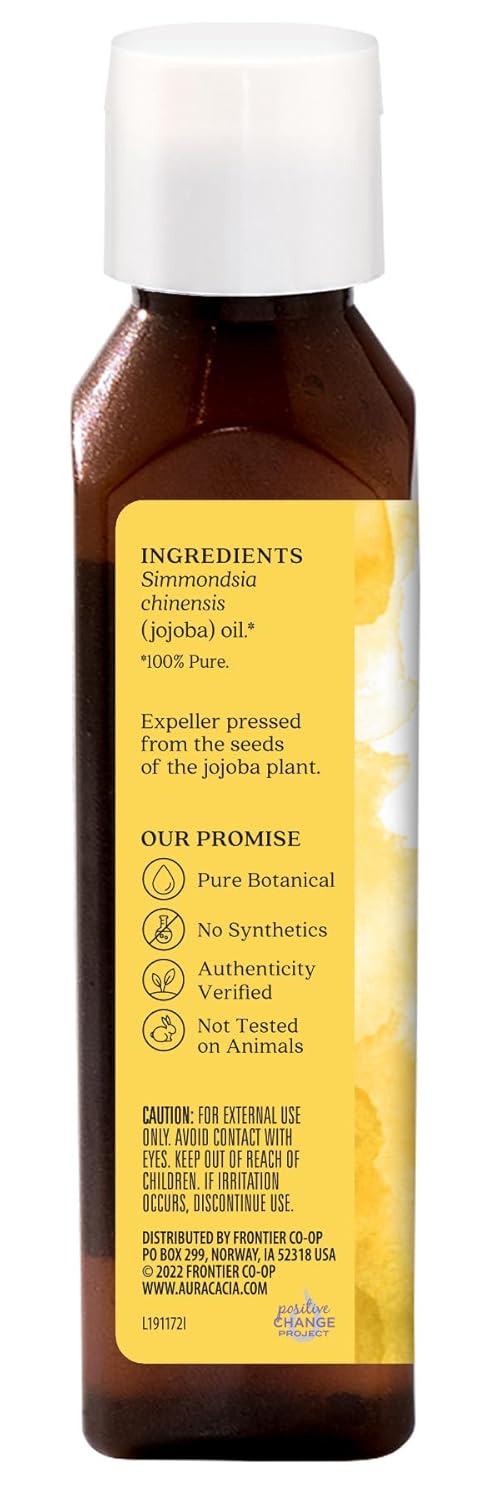 Balancing Hydration: Jojoba oil closely resembles the skinās natural sebum, offering lightweight, fast-absorbing moisture without a greasy feel. Suggested Uses: Apply as a daily facial or body moisturizer, use to nourish dry scalp and hair, or blend with essential oils for custom massage and skin care blends. No artificial fragrances or colors: Aura Cacia products contain only plant and mineral-based ingredients. All scents and colors are the result of nature. Aura Cacia's Promise - When it comes to pure essential oils, it all begins at the botanical source. Aura Cacia is committed to delivering essential oils from all over the globe with integrity and botanical authority. About Us: Aura Cacia was founded over 40 years ago on pure essential oils and true aromatherapy benefits. Most importantly, we're part of a member owned co-op that puts people and planet ahead of profits. āŗ See more product details,Balancing Hydration: Jojoba oil closely resembles the skinās natural sebum, offering lightweight, fast-absorbing moisture without a greasy feel,Suggested Uses: Apply as a daily facial or body moisturizer, use to nourish dry scalp and hair, or blend with essential oils for custom massage and skin care blends,No artificial fragrances or colors: Aura Cacia products contain only plant and mineral-based ingredients. All scents and colors are the result of nature,Aura Cacia's Promise - When it comes to pure essential oils, it all begins at the botanical source. Aura Cacia is committed to delivering essential oils from all over the globe with integrity and botanical authority,About Us: Aura Cacia was founded over 40 years ago on pure essential oils and true aromatherapy benefits. Most importantly, we're part of a member owned co-op that puts people and planet ahead of profits
