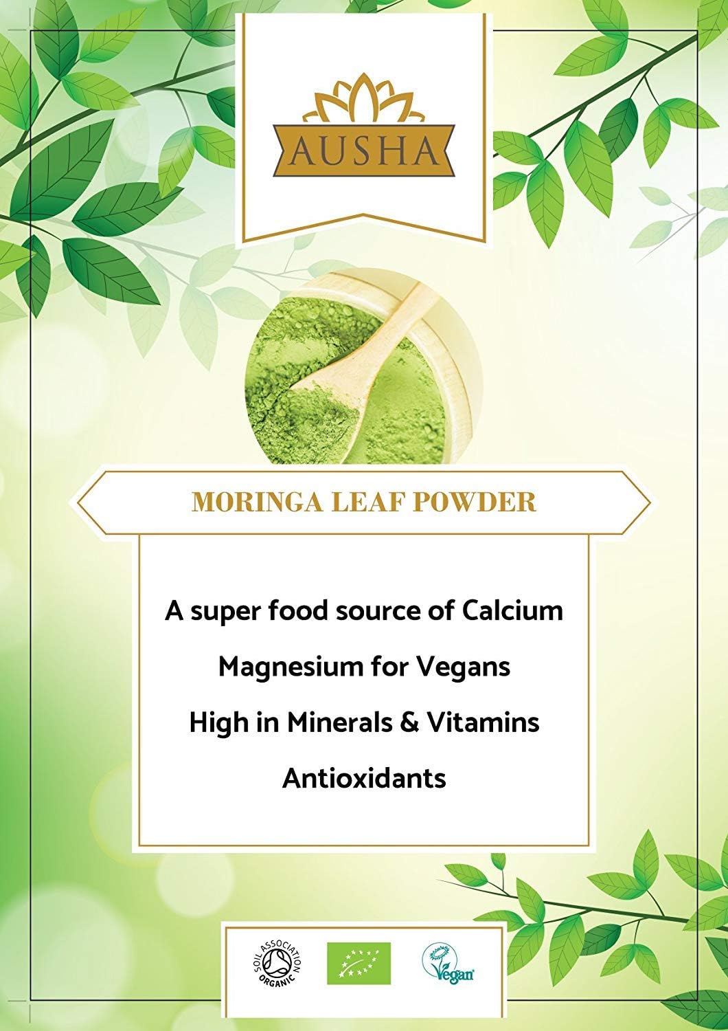 5 > Ausha Moringa Leaf Powder is Certified by Soil Association & Vegan Society Certified.Suitable for Vegans & Vegetarians,100% Organic.Tested for Heavy Metals & Pesticides