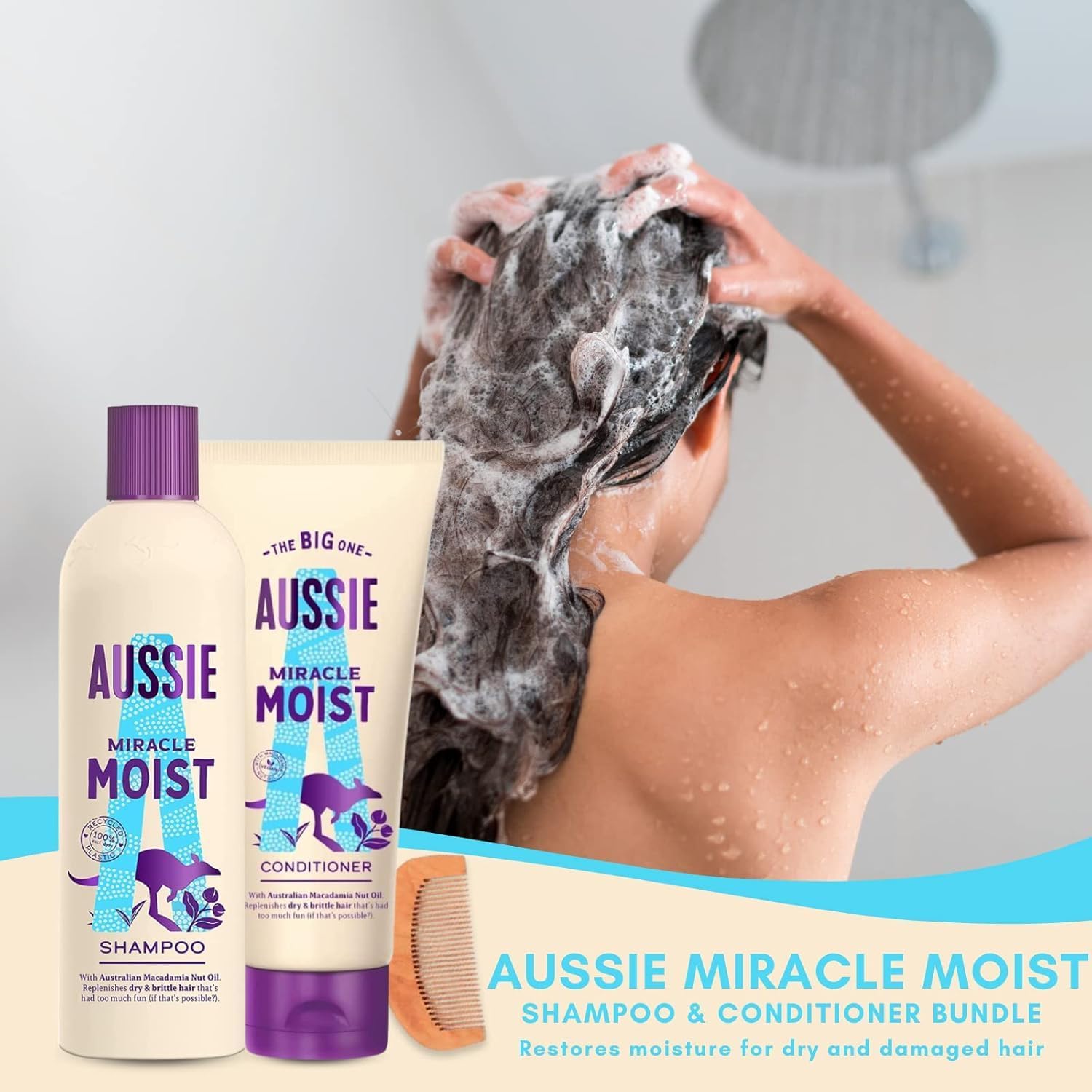 About this item MOISTURISING FORMULA: Contains Australian Macadamia Nut Oil to deeply nourish and replenish dry, brittle hair COMPLETE SET: Includes both shampoo and conditioner for a comprehensive hair care routine PACKAGING: Made with 100% recycled plastic bottles, featuring distinctive purple caps and cream-coloured containers HAIR TYPE SPECIFIC: Specially formulated for dry and brittle hair that needs extra moisture and care Aussie Moisturising Shampoo and Conditioner turn REALLY parched locks to fabulously refreshed locks › See more product details,MOISTURISING FORMULA: Contains Australian Macadamia Nut Oil to deeply nourish and replenish dry, brittle hair,COMPLETE SET: Includes both shampoo and conditioner for a comprehensive hair care routine,PACKAGING: Made with 100% recycled plastic bottles, featuring distinctive purple caps and cream-coloured containers,HAIR TYPE SPECIFIC: Specially formulated for dry and brittle hair that needs extra moisture and care,Aussie Moisturising Shampoo and Conditioner turn REALLY parched locks to fabulously refreshed locks