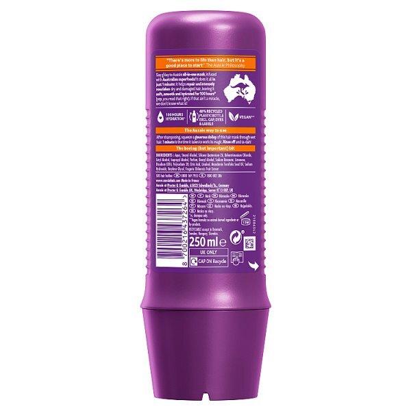 Dry, Damaged Hair Crying Out For Help? Say GāDay To Aussie 1 Minute Miracle Hair Mask, Infused With Australian Superfoods. This All-In-One Mask Works Its Magic In Just 60 Seconds. It Helps Repair And Intensely Nourishes Dry And Damaged Hair, Leaving It Soft, Smooth And Hydrated For 100 Hours* (Yep, You Read That Right)! If That AināT A Miracle, We DonāT Know What Is! *Vs. Shampoo Only Features And Benefits: Repair & Nourish: Aussie All-In-One Hair Mask Helps Repair And Intensely Nourishes Dry, Damaged Hair In Just 1 Minute Dry, Damaged Hair Calling Sos? We'Re Throwing You A Lifeline To Leave Your Hair Aussomely Hydrated Say G'Day To Aussomely Hydrated Hair. Hair Will Be Left Feeling Soft, Smooth And Aussomely Hydrated For 100 Hours. If That AināT A Miracle, We DonāT Know What Is! Vegan Formula Infused With Australian Superfoods: Our Aussie Sos Range Is Vegan, Free From Animal-Derived Ingredients Or By-Products And Infused With Australian Superfoods In No Time At All: Squeeze A Genereous Dollop Of This Hair Mask Through Wet Hair, Leave It For 1 Minute, Rinse Off... Magic! Recyclable: Our Recyclable Bottle Is Made With 40% Recycled Plastic (Excluding Cap, Dyes And Labels) The Aussie Philosophy: āThereāS More To Life Than Hair, But ItāS A Good Place To Start