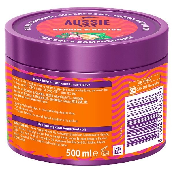 Dry, Damaged Hair In Need Of A Major Reviving Boost? DonāT Panic, WeāRe Throwing You A Lifeline With The Aussie Sos Supercharged Repair Hair Mask. This Repairing Hair Mask Is Infused With Australian Superfoods. It Helps Repair Extremely Stressed Hair, And Protect Against Damage*. For 100 Hours** (Yep, You Read That Right!) Of Soft, Smooth And Hydrated Hair. This Vegan*** Mask Can Be Used Two Ways: As A Rinse-Out Mask For Intense Repair Or As A Leave In Cream For Extra Care. *Against Styling Damage, Vs. Non-Conditioning Shampoo Alone. **Vs. Using Shampoo Alone. ***Vegan Formula: No Animal Derived Ingredients Or By-Products. Features And Benefits: Repair & Revive: Aussie Reviving Hair Mask Helps Repair And Revive Stressed Hair While Protecting It Against Future Damage Extremely Dry And Damaged Hair In Need Of A Major Reviving Boost? We'Re Throwing You An Aussie Lifeline To Leave You With Aussomely Hydrated Hair. Take That Hair Damage! Say G'Day To Aussomely Hydrated Hair. Hair Will Be Left Feeling Soft, Smooth And Aussomely Hydrated For 100 Hours. If That AināT A Miracle, We DonāT Know What Is! Vegan Formula Infused With Australian Superfoods: Our Aussie Sos Range Is Vegan, Free From Animal-Derived Ingredients Or By-Products And Infused With Australian Superfoods For A Complete Hair Rescue, Use With Aussie Sos Repair & Revive Shampoo And Conditioner. For Extra Moisture, Also Use Our Sos Super Serum The Aussie Philosophy: āThereāS More To Life Than Hair, But ItāS A Good Place To Start.ā
