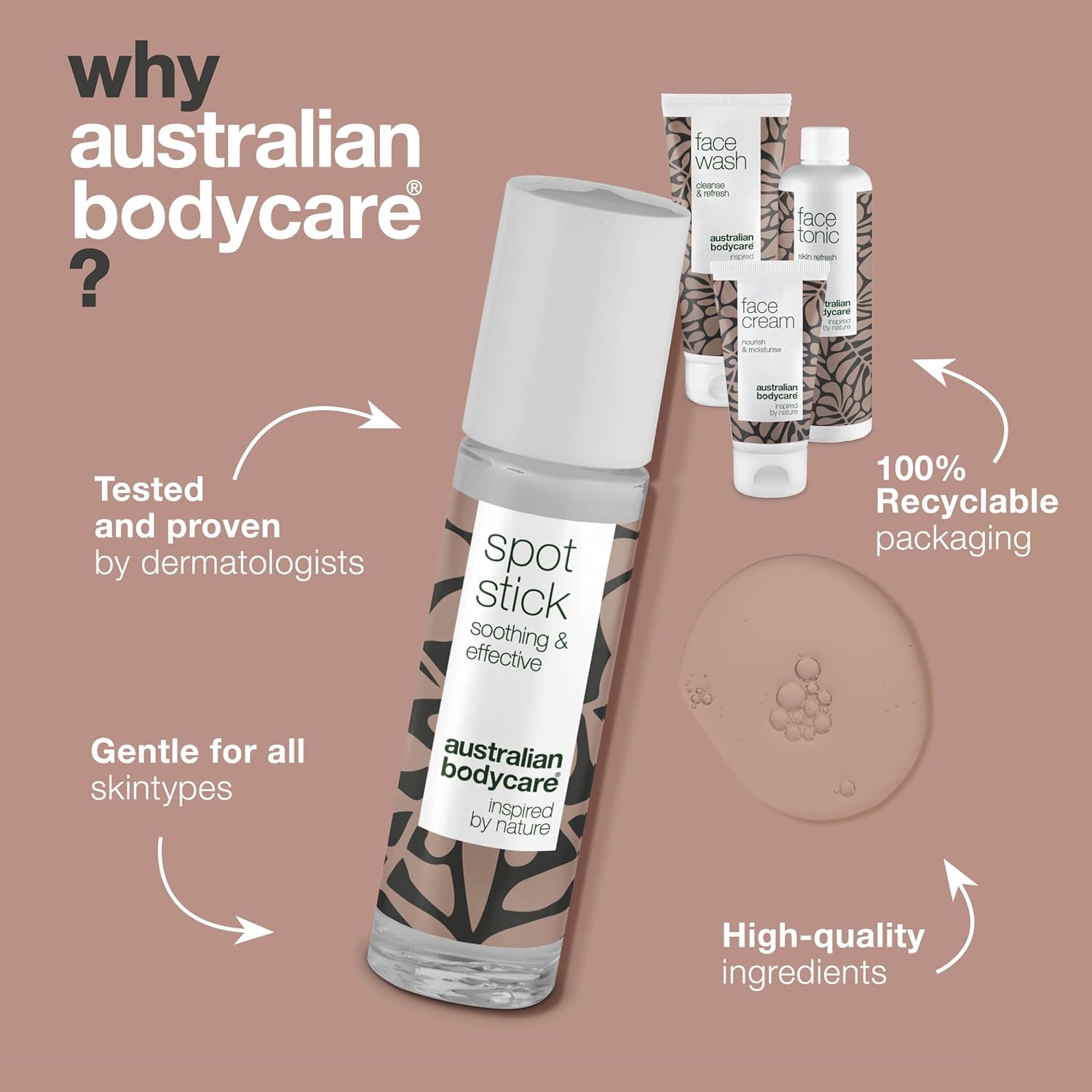 About this item ?? RESULTS: What can I expect and when Most men and women will begin to see results after 1-3 weeks when using the 4 products, especially if they use the products both morning and evening. It’s important that you don't expect results overnight, it will take some time. If you haven’t seen any signs of improvement after 2 weeks, send us a mail and receive a FULL REFUND! ?? HOW TO USE: How often should I use the products Wash your skin thoroughly morning and evening with our face wash that cleanses the skin free of dirt, bacteria and other substances that can clog the pores. Once you have washed your skin, you can deeply cleanse the skin with our face tonic. And finally, moisturise your skin with Australian Bodycare face cream – so it doesn’t dry out. If you need occasional treatment of an annoying pimple that suddenly pops up, you can use the little spot stick ?? PRODUCT INFO: Light and moisturising face products with Australian Tea Tree Oil, which effectively prevents blemishes while nourishing the skin. Tea Tree Oil is antibacterial and helps prevent bacteria from clinging to the skin. Contains extract of Kakadu Plum, which is protective thanks to its high antioxidant properties. Tasmanian pepper has a soothing effect and prevents irritation. Macadamia Nut Oil and allantoin soothe and hydrate the skin. Dermatologically tested by experts. ?? SUITABILITY We have been developing problem-solving skin care products of superior quality for more than 30 years. We develop all our products using top?shelf ingredients. With regards to quality, we do not compromise. Our product is 100% vegan and contains natural active ingredients. ?? 100% SATISFACTION: Australian Bodycare provides a full refund within 180 days including shipping. No questions asked, and no returns necessary. If you are not completely satisfied with the product, we will refund your purchase. DELIVERY: Is the packaging discreet Yes, the product will be delivered in a plain brown box. › See more product details,?? RESULTS: What can I expect and when Most men and women will begin to see results after 1-3 weeks when using the 4 products, especially if they use the products both morning and evening. It’s important that you don't expect results overnight, it will take some time. If you haven’t seen any signs of improvement after 2 weeks, send us a mail and receive a FULL REFUND!,?? HOW TO USE: How often should I use the products Wash your skin thoroughly morning and evening with our face wash that cleanses the skin free of dirt, bacteria and other substances that can clog the pores. Once you have washed your skin, you can deeply cleanse the skin with our face tonic. And finally, moisturise your skin with Australian Bodycare face cream – so it doesn’t dry out. If you need occasional treatment of an annoying pimple that suddenly pops up, you can use the little spot stick,?? PRODUCT INFO: Light and moisturising face products with Australian Tea Tree Oil, which effectively prevents blemishes while nourishing the skin. Tea Tree Oil is antibacterial and helps prevent bacteria from clinging to the skin. Contains extract of Kakadu Plum, which is protective thanks to its high antioxidant properties. Tasmanian pepper has a soothing effect and prevents irritation. Macadamia Nut Oil and allantoin soothe and hydrate the skin. Dermatologically tested by experts,?? SUITABILITY We have been developing problem-solving skin care products of superior quality for more than 30 years. We develop all our products using top?shelf ingredients. With regards to quality, we do not compromise. Our product is 100% vegan and contains natural active ingredients,?? 100% SATISFACTION: Australian Bodycare provides a full refund within 180 days including shipping. No questions asked, and no returns necessary. If you are not completely satisfied with the product, we will refund your purchase. DELIVERY: Is the packaging discreet Yes, the product will be delivered in a plain brown box