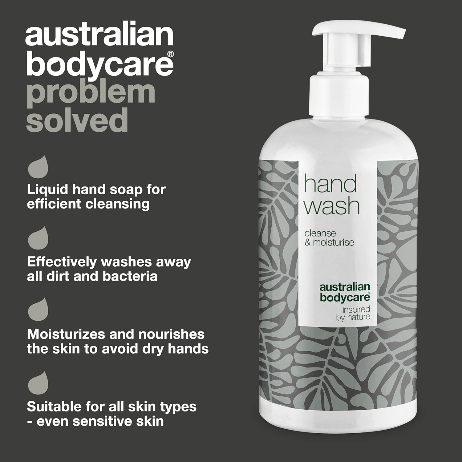 About this item ?? Hand washing is one of the most important things you can do to protect yourself from illness, so you should not compromise on quality when choosing just the right soap. ?? Liquid hand soap, Hand Wash from Australian Bodycare, effectively washes away bacteria and is formulated for frequent hand washing. ?? Hand Wash is anti-bacterial but mild on the skin, suitable for all skin types β including sensitive skin and has been dermatologically tested. ?? Frequent and thorough hand washing is important for removing bacteria from your hands. Even with this Hand Wash which is very mild and non-drying, frequent hand washing can lead to dry hands. We. therefore recommend that you also moisturise your hands with Hand Cream regularly. ?? Use Hand Wash every time you wash your hands. It is important to wash your palms, backs of your hands, between your fingers and your thumbs to get rid of all bacteria and dirt. βΊ See more product details,?? Hand washing is one of the most important things you can do to protect yourself from illness, so you should not compromise on quality when choosing just the right soap,?? Liquid hand soap, Hand Wash from Australian Bodycare, effectively washes away bacteria and is formulated for frequent hand washing,?? Hand Wash is anti-bacterial but mild on the skin, suitable for all skin types β including sensitive skin and has been dermatologically tested,?? Frequent and thorough hand washing is important for removing bacteria from your hands. Even with this Hand Wash which is very mild and non-drying, frequent hand washing can lead to dry hands. We. therefore recommend that you also moisturise your hands with Hand Cream regularly,?? Use Hand Wash every time you wash your hands. It is important to wash your palms, backs of your hands, between your fingers and your thumbs to get rid of all bacteria and dirt
