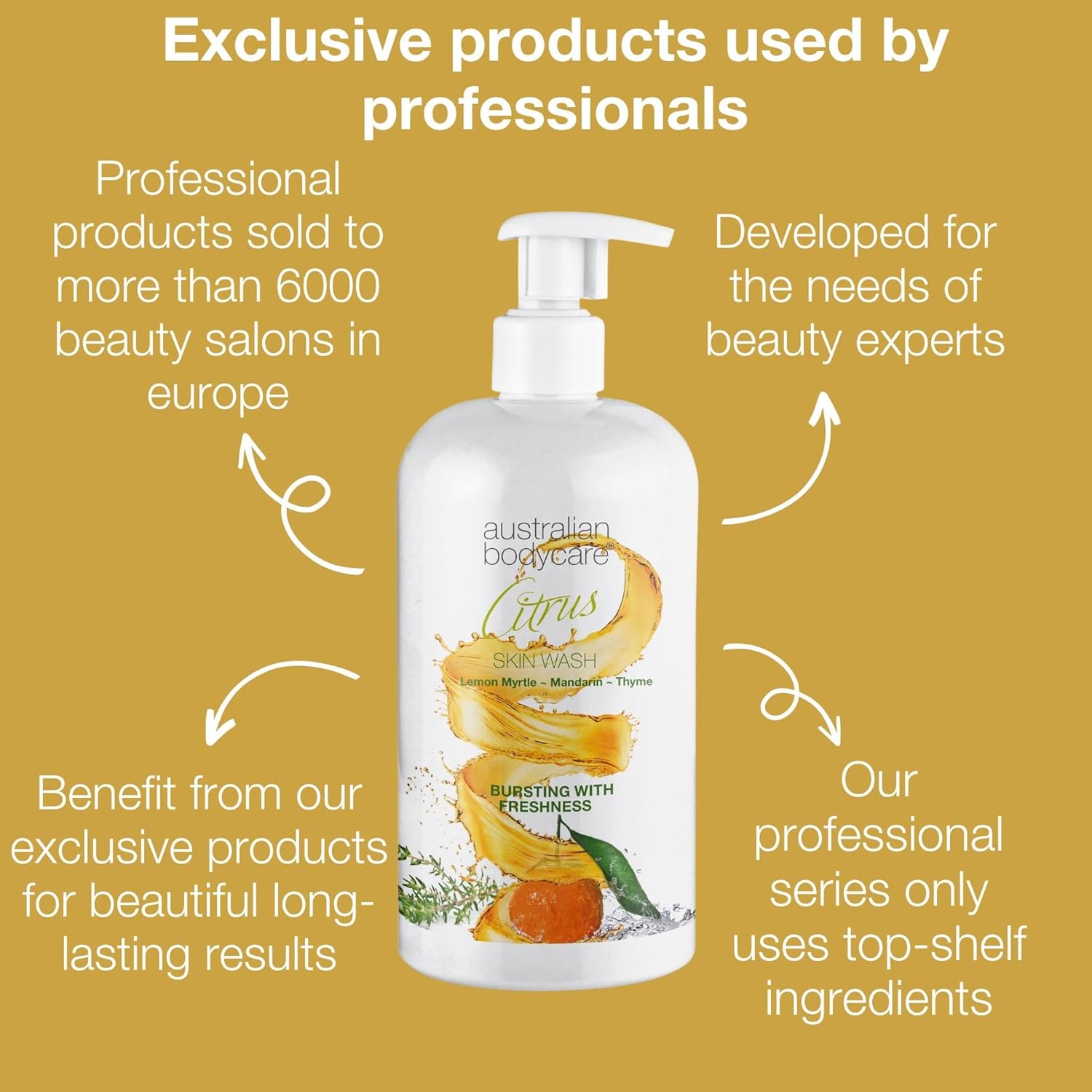 Product description Citrus Skin Wash for Professional Use | Suitable as both hand soap and body soap | Effective against skin problems, e.g. pimples and impure skin as well as before and after shaving and waxing | Natural Tea Tree Oil, mandarin and thyme oil as well as Lemon Myrtle counteract and effectively prevent sweat odor | Dermatologically tested and 100% vegan Ingredients Aqua/Water, Sodium Laureth Sulfate, Coco-Betaine, Melaleuca Alternifolia (Tea Tree) Leaf Oil, Sodium Chloride, Phenoxyethanol, Backhousia Citriodora (Lemon Myrtle) Leaf Oil, Sodium Benzoate, Citric Acid, PPG-20 Methyl Glucose Ether, Potassium Sorbate, Tocopherol, Tetrasodium Iminodisuccinate, Thymus Vulgaris (Tyme) Flower/Leaf Oil, Citrus Aurantium Dulcis (Orange) Peel Extract/Citrus Aurantium Dulcis (Orange) Oil, Citrus Nobilis (Mandarin Orange) Extract/Citrus Nobilis (Mandarin Orange) Oil, Citral, Limonene, Linalool, Geraniol, CI 75810/Chlorophyllin Copper-complex,?? RESULTS: What can I expect and when You will feel the effect immediately as it mildly cleans your skin without causing dryness. It reduces skin problems and body odour. Although itās important that you don't expect results overnight, it can take some time. If you havenāt seen any signs of improvement after 2 weeks, send us a mail and receive a FULL REFUND! No need to send the bottle back!,?? HOW TO USE: How often should I use the Skin Wash You should use the skin wash daily as required to reduce skin problems, body odour, remove excess oil from your skin and restore the skinās natural protection. The Skin Wash is for daily use for the whole body. Apply with water and lather. Rinse thoroughly,?? PRODUCT INFO: Skin Wash is dermatologically tested and can be used as an everyday body wash. Contains 100% natural Australian Tea Tree Oil of pharmaceutical quality. Every single natural active ingredient was carefully selected for each body product. All products from Australian Bodycare are dermatologically tested and 100% vegan,?? SUITABILITY: The product is safe to use and has been approved by our cosmetic science team. We have been developing problem-solving skin care products of superior quality for more than 30 years. We develop all our products using top?shelf ingredients. With regards to quality, we do not compromise. Our product is 100% vegan and contains 100% natural active ingredients