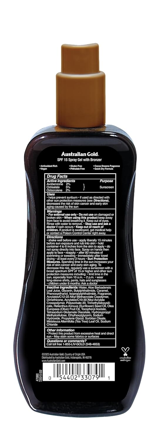 General Protection Spray Gels with Instant Bronzer are an innovative hybrid of a continuous spray and a traditional lotion, fitting for those looking for control, hydration and convenience, plus temporary color for an immediate glow! Enjoy the sun with confidence when you use Australian Gold sunscreens! All of our products are made with real, nutrient-rich Australian ingredients. We aim to make our formulas as clean as possible, without sacrificing powerful sun protection, so you can focus on celebrating life outside!,SPF 4 SUNSCREEN SPRAY GEL with Sunflower Seed Oil, Olive Fruit Oil & Cocoa Seed Butter is designed to provide ultimate hydration that deeply moisturizes the skin, and the Caramel Bronzer imparts a faux sun-kissed golden glow for an instant tinted look,AUSTRALIAN NATURALS - A rich blend of Kakadu Plum extract with highest content of Vitamin C, and Tea Tree Oil, a powerful antioxidant, fights off free radicals and leaves skin fresh; Comes in a delectable scent of Coconut, Orange, and Vanilla,BROAD SPECTRUM SUNBLOCK shields the skin from both UVA and UVB rays and reduces the adverse effects of sunlight; Generously apply this lightweight, non-greasy sheer sun protector and tanning spray gel 15 minutes before stepping out and you are good to go,EASY TO USE SPRAY PUMP - This innovative, hybrid take on continuous spray, traditional lotion and temporary bronzer comes in a convenient spray bottle that gives maximum control and gets easily absorbed by the skin,SPECIALLY FORMULATED SUNSCREEN - Australian Gold's time-tested formula is designed to be Oxybenzone Free, PABA Free, Phthalate Free & Gluten Free; It is sweat and water resistant (up to 80 minutes) and is purely vegan, cruelty free and never tested on animals