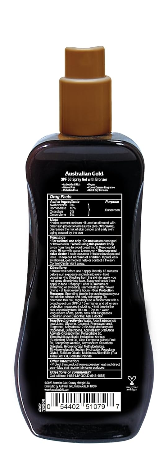 SPF 50 SUNSCREEN SPRAY GEL with Sunflower Seed Oil, Olive Fruit Oil & Aloe Vera is designed to provide ultimate hydration that deeply moisturizes the skin, and the Caramel Bronzer imparts a faux sun-kissed golden glow for an instant tinted lookBLESSED WITH AUSTRALIAN NATURALS - A rich blend of Kakadu Plum extract with highest content of Vitamin C, and Tea Tree Oil, a powerful antioxidant, fights off free radicals and leaves skin fresh. Comes in a delectable scent of Coconut, Orange, and VanillaBROAD SPECTRUM SUNBLOCK shields the skin from both UVA and UVB rays and reduces the adverse effects of sunlight. Generously apply this lightweight, non-greasy sheer sun protector and tanning spray gel 15 minutes before stepping out and you are good to goEASY TO USE SPRAY PUMP - This innovative, hybrid take on continuous spray, traditional lotion and temporary bronzer comes in a convenient spray bottle that gives maximum control and gets easily absorbed by the skinSPECIALLY FORMULATED SUNSCREEN - Australian Gold's time-tested formula is designed to be PABA Free, Dye Free, Alcohol Free & Gluten Free. It is sweat and water resistant (up to 80 minutes). It is cruelty free and never tested on animalsGeneral Protection Spray Gels with Bronzer are an innovative hybrid of a continuous spray and a traditional lotion, fitting for those looking for control, hydration and convenience, plus temporary color for an immediate glow! Enjoy the sun with confidence when you give your skin the unsurpassed protection and slimming bronze tones of Australian Gold sunscreens. When you rely on the nourishing care of the top sun care collection made with real, nutrient-rich Australian ingredients, you look and feel your best for every sunny day!