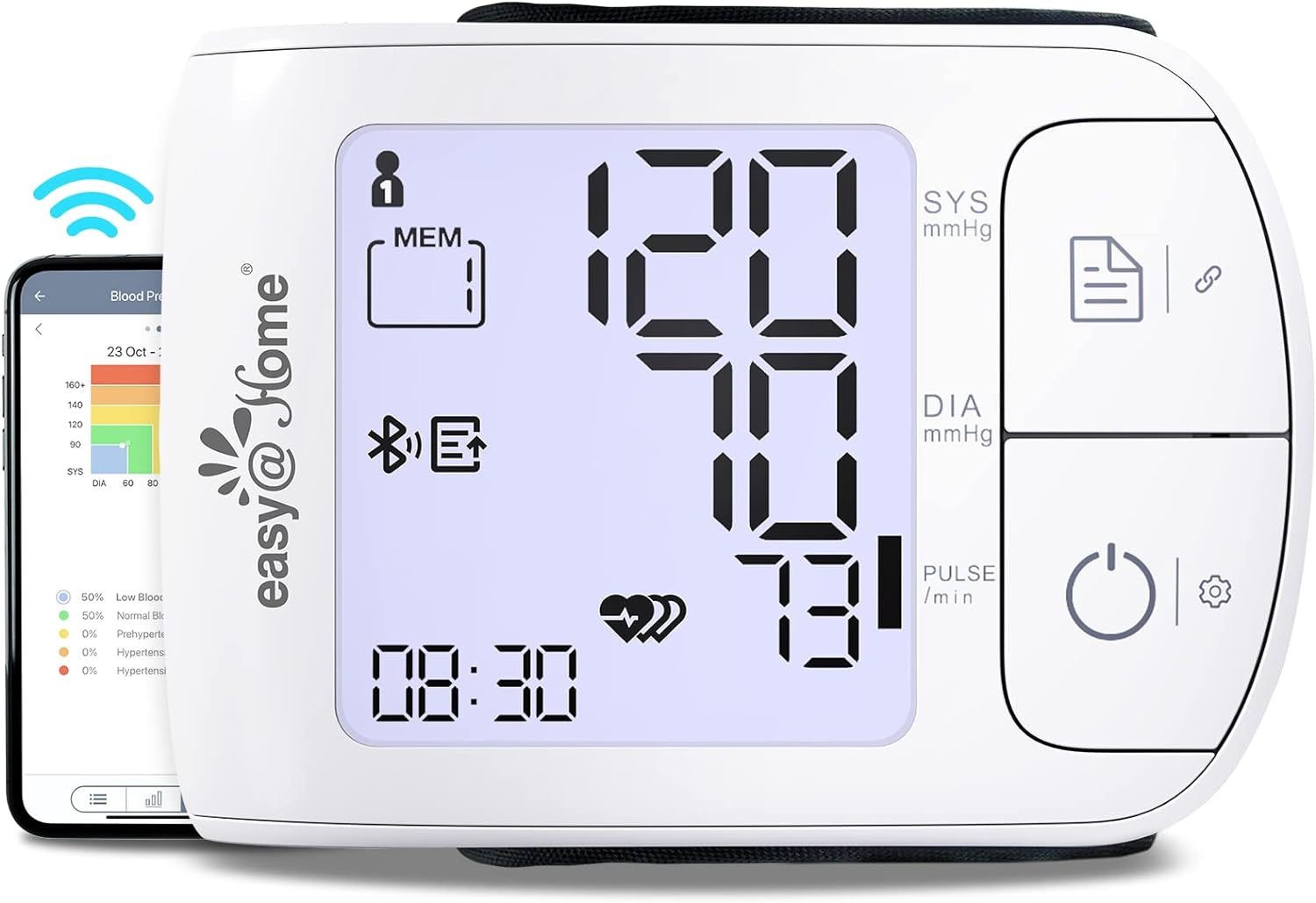 ??Wrist Positioning Guide: When using wrist blood pressure monitor, it’s important to take the measurement while relaxing your wrist at heart level. This will help ensure an accurate reading will be taken. An optional wrist positioning sensor is built-in the device, to help guide your wrist to the ideal position for taking a blood pressure measurement??Free Bluetooth Enabled Smart APP: Easy@Home’s newly launched auto-sync Blood Pressure Monitor can connect to the MedM Health APP via Bluetooth. You can easily store and view daily, monthly, and yearly measurements on your smartphone or tablet, and share PDF/CSV reports with your family or doctor??3 User Mode, 398 Records: The wrist blood pressure machine supports 3 independent users (no memory space for User Guest), stores 398 records total (199 for each user), each reading has a timestamp, and intelligently averages the last three readings to provide you with a more comprehensive and accurate health data. Meanwhile, the free MedM health APP can store unlimited amounts of data??Adjustable Wristband & One Button Design: The 5.3-8.5 inch adjustable wrist strap is suitable for most people to wear and can comfortably measure accurate data.Easy to use with one-touch button to operate, measures your blood pressure and pulse simultaneously, automatically identifies and alerts you to any irregular heart rate??Large display: With the backlit screen display, the machine can clearly show the readings even in low light conditions