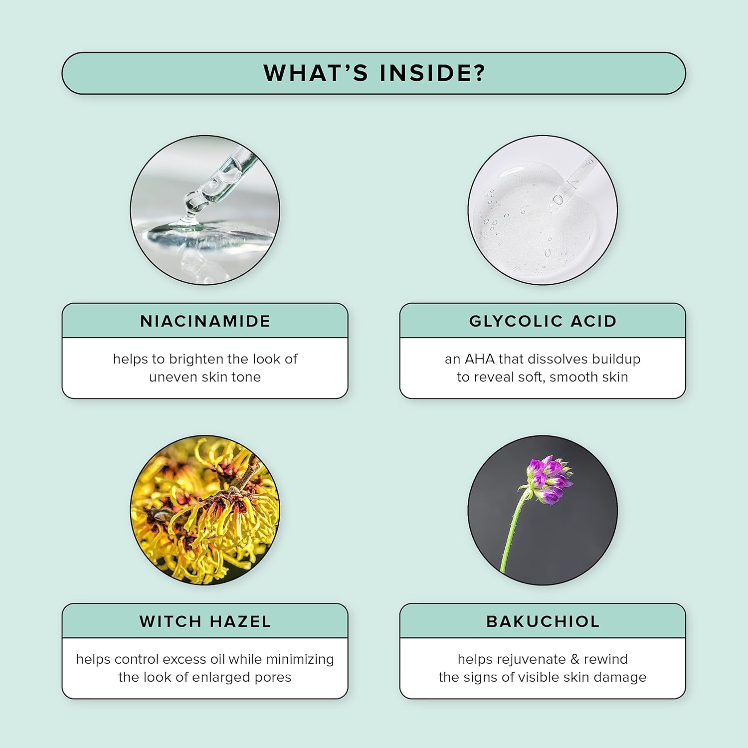 About this item Gentle Exfoliating Facial Toner - Experience smoother-looking skin with our face toner. Glycolic acid and witch hazel work to sweep away excess oil and impurities for a complexion that dazzles! Balanced Glow, No Excess Shine - Achieve a balanced glow without the unwanted shine with our face toner for women and men! This glycolic acid toner mattifies and refines your skin, leaving it beautifully balanced. A Perfect Balance for Your Skin - Give your complexion the refresh it needs with our face exfoliant! This skin toner not only balances your skin's pH but also offers gentle exfoliation, making your skin more receptive to treatments and moisture. Get ready to experience the glow you've been dreaming about. Minimize Pores and Revive Dullness - This exfoliating toner isn't just your average toner. It's a pore minimizer and dullness buster! Watch as it minimizes the appearance of enlarged pores, visibly illuminates uneven skin tone, and helps you achieve a picture-perfect complexion. Natural Defense - Shield your skin from the harsh world outside with the natural ingredients in our skin care toner. This niacinamide and kombucha toner works to calm stressed-out skin and provide a barrier against harmful environmental stressors, so you can confidently face the day. › See more product details,Gentle Exfoliating Facial Toner - Experience smoother-looking skin with our face toner. Glycolic acid and witch hazel work to sweep away excess oil and impurities for a complexion that dazzles!,Balanced Glow, No Excess Shine - Achieve a balanced glow without the unwanted shine with our face toner for women and men! This glycolic acid toner mattifies and refines your skin, leaving it beautifully balanced,A Perfect Balance for Your Skin - Give your complexion the refresh it needs with our face exfoliant! This skin toner not only balances your skin's pH but also offers gentle exfoliation, making your skin more receptive to treatments and moisture. Get ready to experience the glow you've been dreaming about,Minimize Pores and Revive Dullness - This exfoliating toner isn't just your average toner. It's a pore minimizer and dullness buster! Watch as it minimizes the appearance of enlarged pores, visibly illuminates uneven skin tone, and helps you achieve a picture-perfect complexion,Natural Defense - Shield your skin from the harsh world outside with the natural ingredients in our skin care toner. This niacinamide and kombucha toner works to calm stressed-out skin and provide a barrier against harmful environmental stressors, so you can confidently face the day