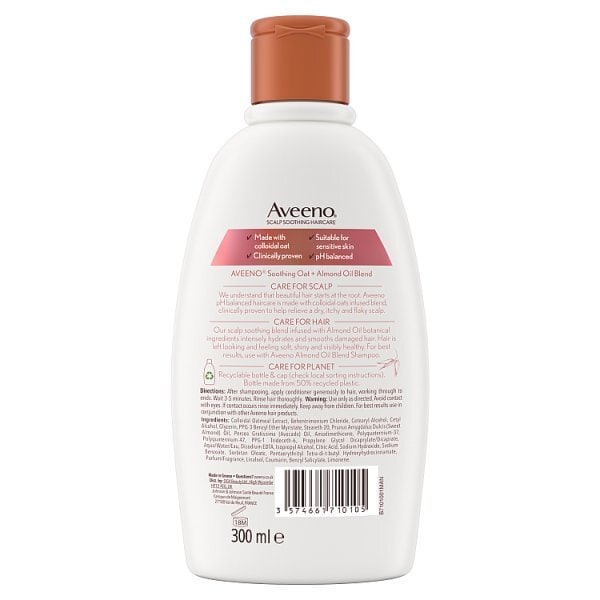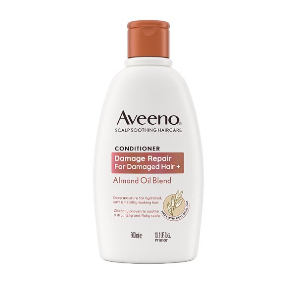 Product Information:Made with colloidal oats and botanical ingredients, Aveeno Almond Oil Damage Repair Conditioner intensely hydrates and smooths damaged hair,Features:Damage Repair For Damaged Hair Made With Colloidal Oat Clinically Proven Suitable For Sensitive Skin Ph Balanced,Warning or Restrictions:Use only as directed. Avoid contact with eyes. If contact occurs rinse immediately. Keep away from children. For best results use in conjunction with other Aveeno hair products,Product Specification:Colloidal Oatmeal Extract, Behentrimonium Chloride, Cetearyl Alcohol, Cetyl Alcohol, Glycerin, PPG-3 Benzyl Ether Myristate, Steareth-20, Prunus Amygdalus Dulcis (Sweet Almond/Amande Douce) Oil, Persea Gratissima (Avocado/Avocat) Oil, Amodimethicone, Polyquaternium-37, Polyquaternium-47, PPG-1 Trideceth-6, Propylene Glycol Dicaprylate/Dicaprate, Acrylates/Stearyl Methacrylate Copolymer, Sorbitan Oleate, Aqua/Water/Eau, Disodium EDTA, Isopropyl Alcohol, Sodium Chloride, Citric Acid, Sodium Hydroxide, Sodium Benzoate, Pentaerythrityl Tetra-di-t-butyl Hydroxyhydrocinnamate, Parfum/Fragrance, Linalool, Coumarin, Benzyl Salicylate, Limonene,Product Uses:After shampooing, apply conditioner generously to hair, working through to ends. Wait 3-5 minutes. Rinse hair thoroughly,Recyclable:Recyclable bottle & cap (check local sorting instructions). Bottle made from 50% recycled plastic