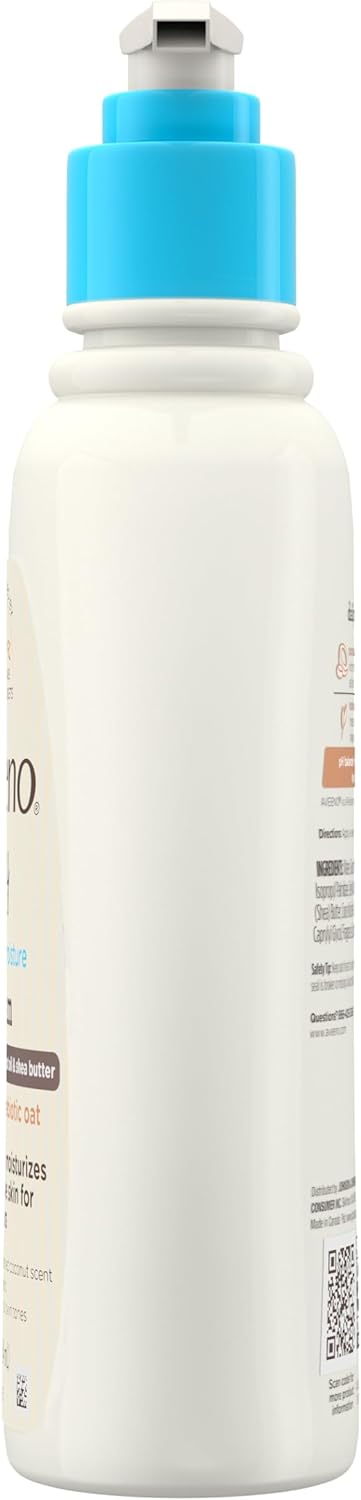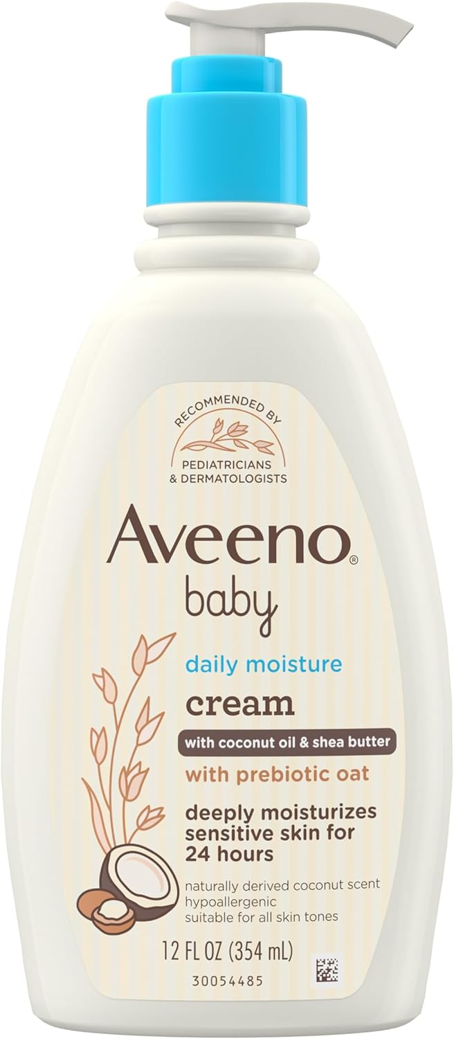 12-fluid ounces of Aveeno Baby Daily Moisturizing Cream, with Prebiotic Oat, Coconut Oil and Shea Butter & a gentle, naturally derived* coconut scent to deeply moisturize baby's skin *as per ISO 16128-1:201710This gentle baby body cream deeply moisturizes sensitive skin for 24 hours. The daily baby lotion is formulated with coconut oil & shea butter, rich moisturizers suitable for all skin tones, even sensitive skin10The baby moisturizer and dimethicone skin protectant cream with a gentle scent is made with nourishing prebiotic oat to help keep baby's developing skin feeling and looking healthy10Daily moisturizing baby cream suitable for all skin tones is pH balanced, hypoallergenic & free of parabens, phthalates, dyes & phenoxyethanol for baby's delicate skin. It features a gentle, naturally derived* coconut scent *as per ISO 16128-1:201710From Aveeno, a pediatrician & dermatologist-recommended brand, use this daily moisturizing baby body lotion with prebiotic oat to help prevent & temporarily protect chafed, chapped or cracked skin. Apply baby body cream as needed