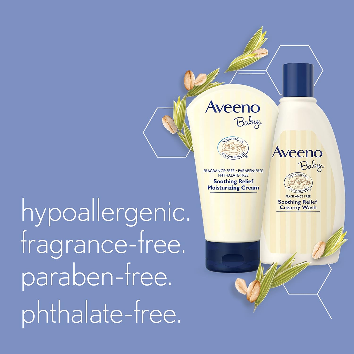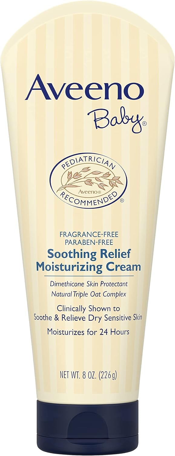 8-ounce tube of Aveeno Baby Soothing Relief Moisturizing Cream to help soothe and hydrate your baby's delicate, dry, sensitive skin10From the pediatrician-recommended brand, this moisturizing baby cream is specially formulated for infants and babies and is steroid-, phthalate- and paraben-free10Made with natural Colloidal Oatmeal and rich emollients, this fragrance-free baby cream helps maintain skin's moisture barrier to prevent and protect against dryness and is clinically shown to relieve dry, sensitive skin10This unique baby cream formula is fragrance-free, non-greasy and absorbs quickly leaving your baby's skin hydrated for a full 24 hours and helping prevent and protect chafed, chapped, and cracked skin10For best results, use this moisturizing baby cream with dimethicone skin protectant alongside Aveeno Baby Soothing Relief Creamy Wash to keep your little one's skin hydrated and protected