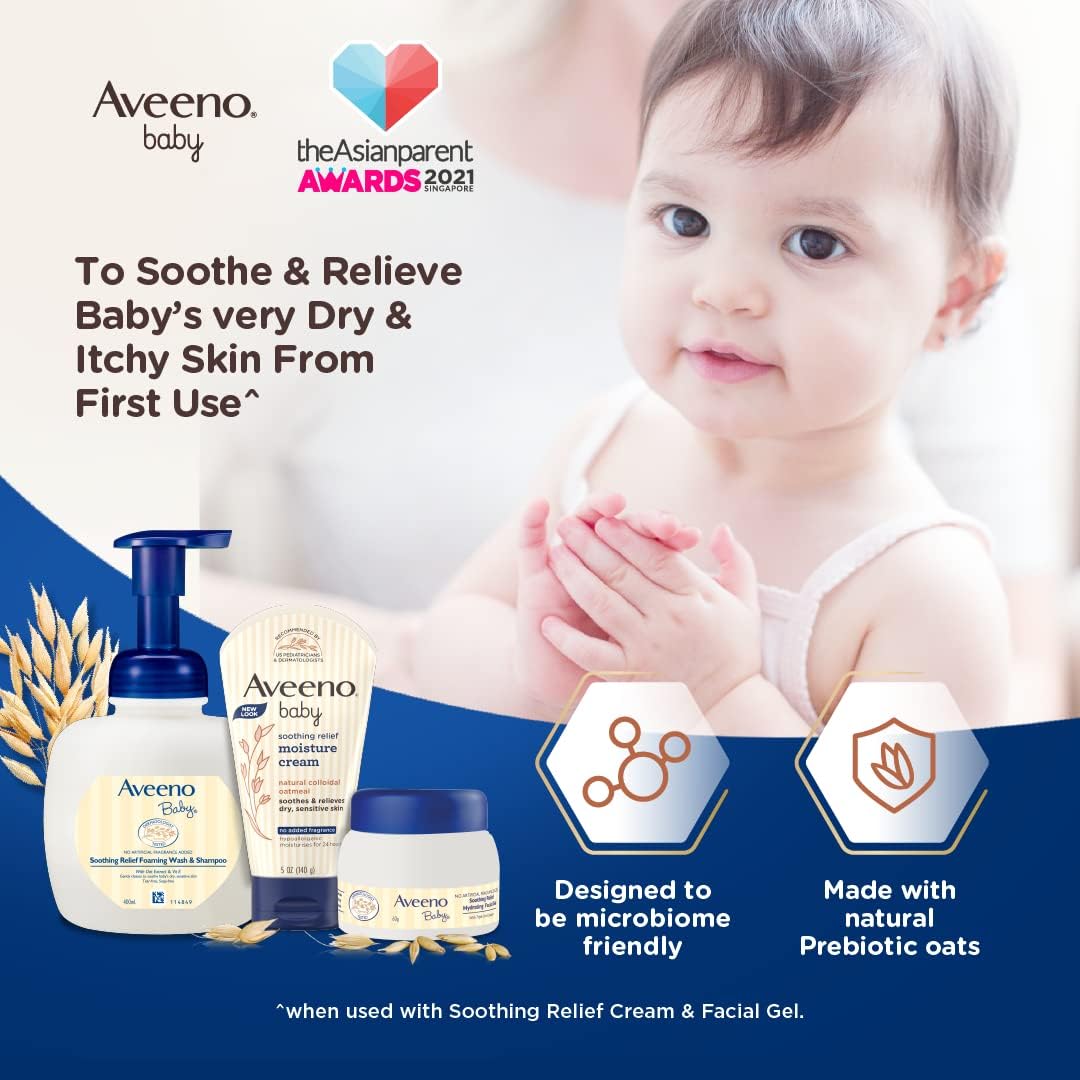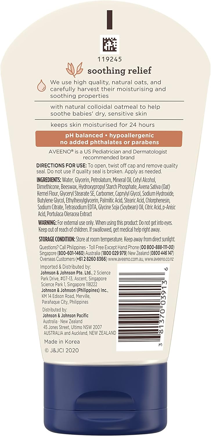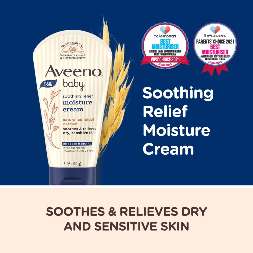 5-ounce tube of Aveeno Baby Soothing Relief Moisturizing Cream to help soothe and hydrate your baby's delicate skin10From the pediatrician-recommended brand, this moisturizing cream is specially formulated for babies and is steroid-, phthalate- and paraben-free10Made with natural Colloidal Oatmeal and rich emollients, this fragrance-free baby cream helps maintain skin's moisture barrier to prevent and protect against dryness and is clinically shown to relieve dry, sensitive skin10This unique baby cream formula is fragrance-free, non-greasy and absorbs quickly leaving your baby's skin hydrated for a full 24 hours10For best results, use this moisturizing baby cream twice a day to keep your little one's skin hydrated and protected with dimethicone skin protectant