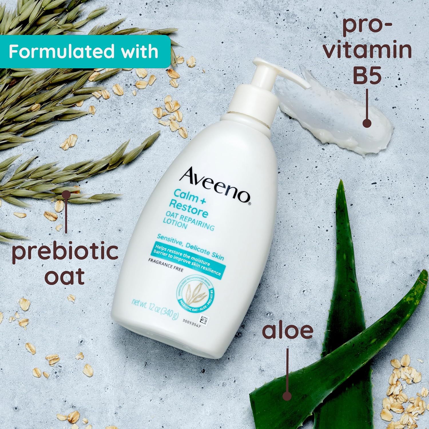 Aveeno Calm + Restore Oat Repairing Body Lotion For Sensitive Skin, Daily Moisturizer With Prebiotic Oat, Aloe & Pro-Vitamin B5 Helps Restore Skin'S Moisture Barrier, Fragrance Free, 12 Oz