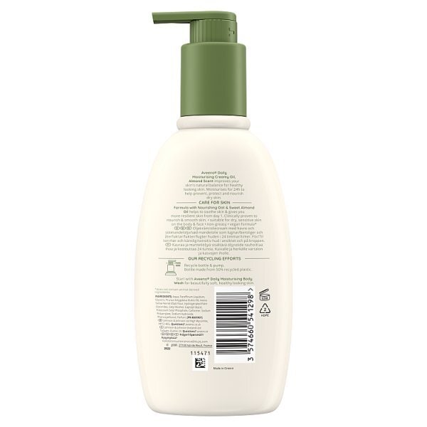 Product Information:Non greasy With naturally active ingredients With sweet almond oil and colloidal oatmeal Moisturises like an oil, absorbs like a cream,Benefit:Moisturising Creamy Oil is formulated with the concentrated goodness of finely-milled naturally active Colloidal Oatmeal and Sweet Almond Oil, known for their moisturising properties. It combines the benefits of an oil with the convenience of a cream, helping to maintain the skin's natural moisture level and prevent dry skin. Skin is left looking and feeling soft, smooth and healthy without a greasy after-feel,Product Specification:Aqua,Sesamum Indicum (Sesame) Seed Oil,Di-Ppg-3 Myristyl Ether Adipate,Hydrogenated Polydecene,Dimethicone,Glycerin,Cetyl Alcohol,Prunus Amygdalus Dulcis (Sweet Almond) Oil,Avena Sativa (Oat) Kernel Oil,Avena Sativa (Oat) Kernel Flour,Caprylyl Glycol,Lauroyl Lysine,P-Anisic Acid,Acrylates/C10-30 Alkyl Acrylate Crosspolymer,Myristyl Alcohol,Glyceryl Stearate,Stearyl Alcohol,Peg-100 Stearate,Magnesium Aluminum Silicate,Titanium Dioxide,Xanthan Gum,Tetrasodium Edta,Sodium Hydroxide,Citric Acid,Bht,Parfum,Recyclable:Pack - Recyclable