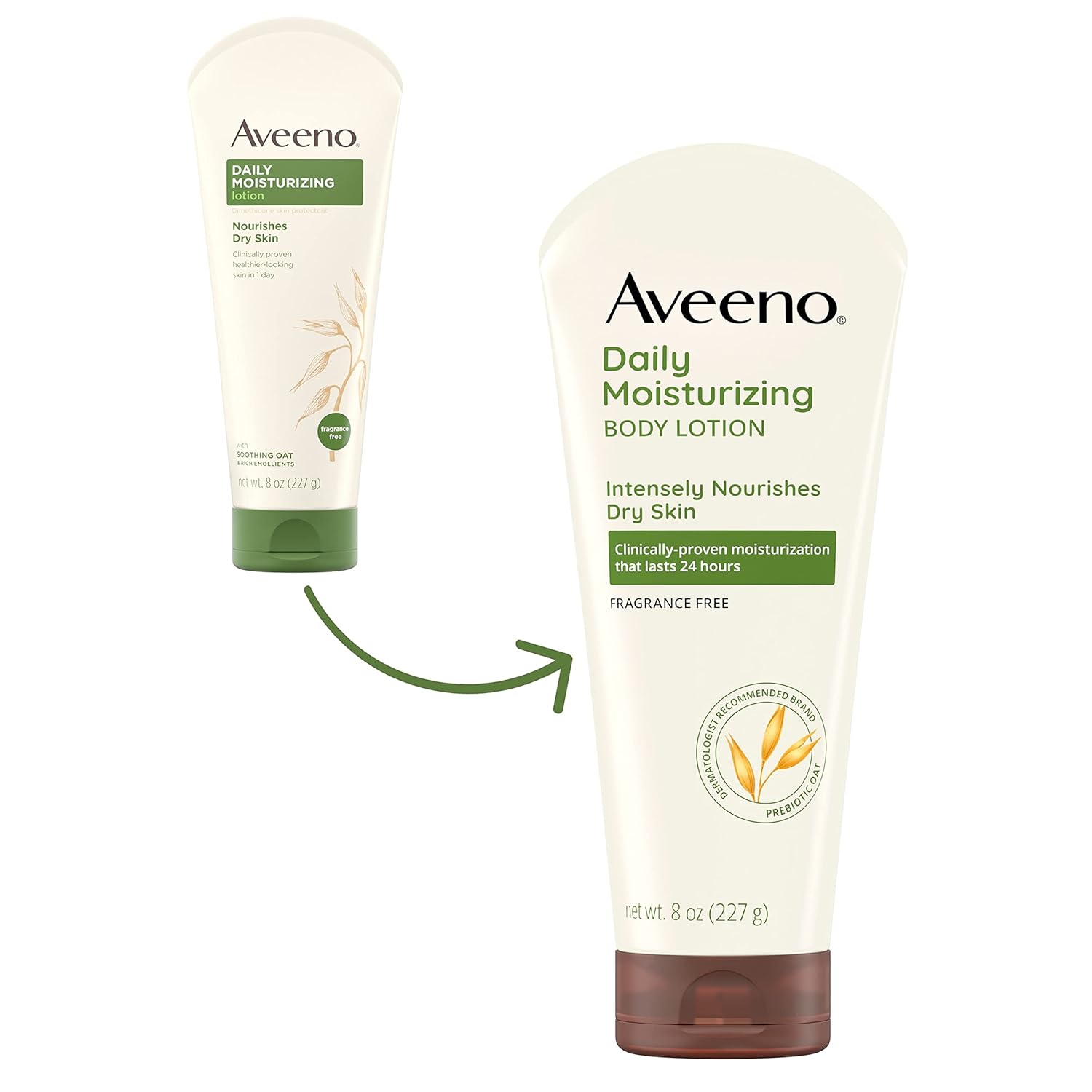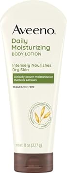 Aveeno Daily Moisturizing Body Lotion helps improve the health of your dry skin in one day. Formulated with soothing oatmeal and rich emollients, it is clinically shown to help moisturize and relieve dryness. This daily body lotion replenishes moisture for softer and smoother skin. The unique oatmeal formula absorbs quickly, leaving your skin soft, beautiful and healthy-looking. Recommended by dermatologists, it is fragrance-free, non-greasy, non-comedogenic, and gentle enough for daily use