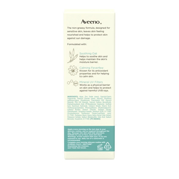 Product Information:Immediately moisturise and leave skin feeling nourished with the Aveeno CALM+RESTOREĀ® Nourishing Daily Moisturiser SPF 30,Features:Moisturisation, Helps To Prevent Hyperpigmentation, Fine Lines, And Wrinkles Caused By Sun Exposure, & Helps To Protect Against Sun Damage Broad Spectrum Uv Protection: Formulated With 100% Mineral Uv Filters That Works As A Physical Barrier On Skin Helping To Protect Skin Against Uv Rays Sheer Tint: Developed To Blend Into All Skin Tones, Fast Absorbing, Non-Greasy And Lightweight Formula Can Be Used Alone Or Under Makeup Formulated For Sensitive Skin: Enriched With Soothing Oat & Calming Feverfew, Dermatologist Tested, Fragrance Free, Non-Comedogenic, Hypoallergenic* *Formulated To Minimise The Risk Of Allergies,Warning or Restrictions:Warnings: Avoid contact with eyes. If you are exposed to sun, daily use of a sunscreen is recommended,Product Specification:Aqua, Zinc Oxide (nano), Caprylic/Capric Triglyceride, Titanium Dioxide (nano), Glycerin, Ethylhexyl methoxycrylene, Dimethicone, Triacontanyl PVP, Glyceryl Stearate, PEG-100 Stearate, Calcium Sodium Borosilicate, Polyhydroxystearic Acid, VP/Hexadecene Copolymer, Xanthan Gum, Aluminum Hydroxide, Cetearyl Olivate, Stearic Acid, Triethoxycaprylylsilane, Phenoxyethanol, Ethylhexylglycerin, Cetearyl Alcohol, Sodium Chloride, Sorbitan Olivate, Chlorphenesin, Tocopheryl Acetate, Disodium EDTA, CI 77492, Chrysanthemum Parthenium Flower/Leaf/Stem Juice, CI 77491, Pentylene Glycol, Avena Sativa Kernel (Oat) Extract, Potassium Sorbate, Sodium Metabisulfite, Citric Acid, Sodium Benzoate, Tocopherol, CI 77499,Product Uses:Apply every morning as the last step in your skincare routine, and as required throughout the day. Massage into skin until fully absorbed. Suitable for use on face, neck, and chest,Recyclable:Recycle carton and tube. Keep cap on. Tube made with 40% recycled plastic, excluding cap