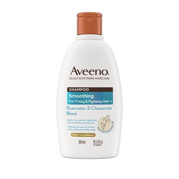 Product Information:Made with colloidal oats and botanical ingredients, Aveeno Rosewater & Chamomile Smoothing Shampoo gently cleanses and weightlessly nourishes dry hair while soothing the scalp,Features:Smoothing For Frizzy/Fly-Away Hair Sulfate-Free Surfactants Clinically Proven Suitable For Sensitive Skin Ph Balanced,Warning or Restrictions:Use only as directed. Avoid contact with eyes. If contact occurs rinse immediately. Keep away from children. For best results use in conjunction with other Aveeno hair products,Product Specification:Colloidal Oatmeal Extract, Aqua/Water/Eau, Sodium C14-16 Olefin Sulfonate, Cocamidopropyl Betaine, Glycol Distearate, Sodium Chloride, Rosa Damascena (Damask Rose/Rose De Damas) Flower Water, Chamomilla Recutita (Matricaria/Matricaire) Flower/Leaf Extract, Polyquaternium-22, Linoleamidopropyl PG-Dimonium Chloride Phosphate, PEG-7 Amodimethicone, Acrylates/C10-30 Alkyl Acrylate Crosspolymer, Polyquaternium-39, Sodium Hydrolyzed Potato Starch Dodecenylsuccinate, Laureth-4, PEG-150 Pentaerythrityl Tetrastearate, PPG-2 Hydroxyethyl Cocamide, Propylene Glycol, Glycerin, Hexylene Glycol, Sodium Citrate, Citric Acid, Sodium Hydroxide, Sodium Benzoate, Formic Acid, Potassium Sorbate, Tocopheryl Acetate, Leuconostoc/Radish Root Ferment Filtrate, Disodium Tetrapropenyl Succinate, Coconut Acid, Parfum/Fragrance, Benzyl Salicylate, Hydroxycitronellal, Alpha-Isomethyl Ionone,Product Uses:Apply shampoo generously to wet hair, massage into a lather through to ends, then rinse the hair thoroughly. After shampooing, follow with conditioner,Recyclable:Recyclable bottle & cap (check local sorting instructions). Bottle made from 50% recycled plastic
