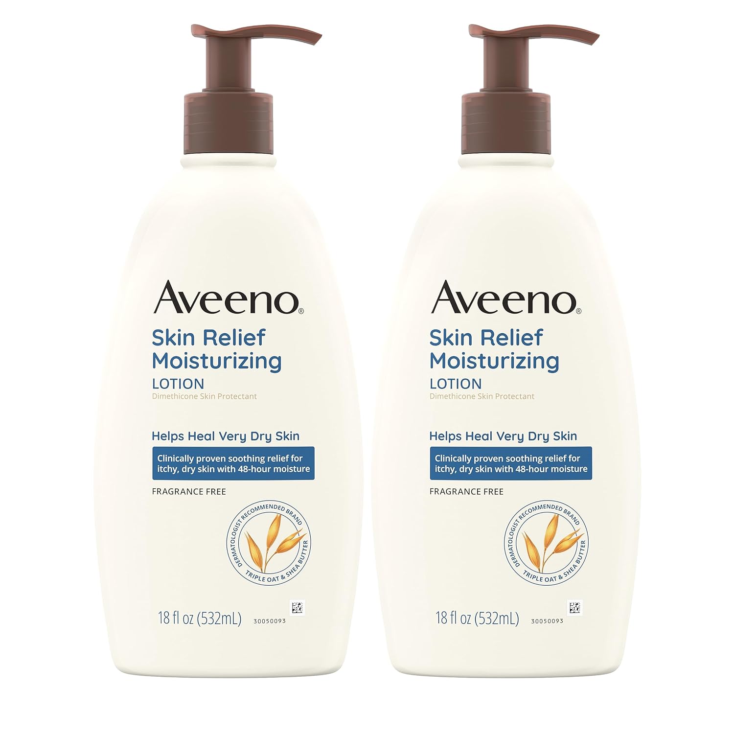 Two, 18-Fluid Ounce Bottles Of Aveeno Skin Relief Fragrance-Free Moisturizing Body Lotion With A Soothing Triple Oat And Shea Butter Formula Helps Heal Very Dry Skin And Provides Clinically Proven Relief For Itchy, Dry Skin With 48-Hour Moisture