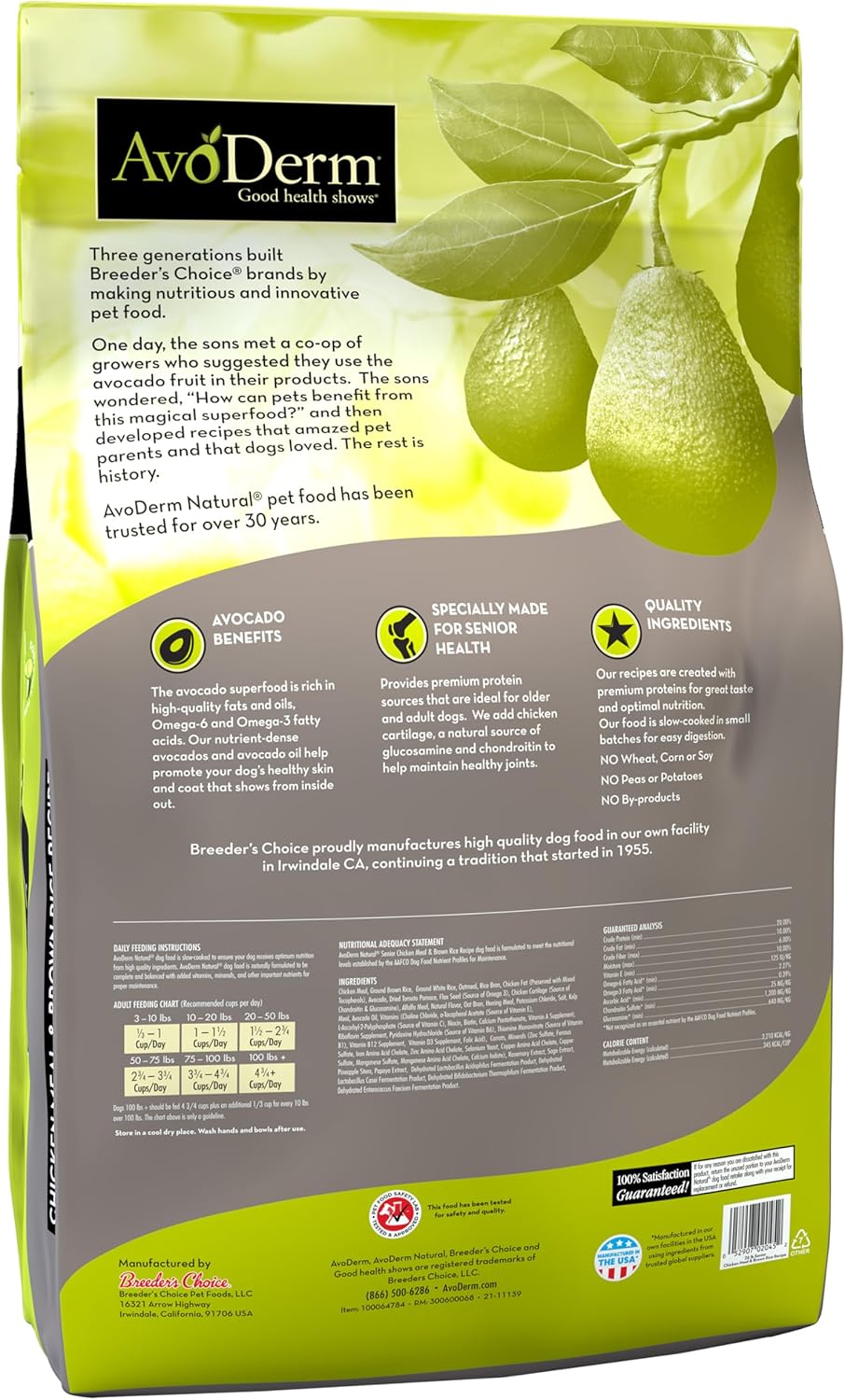 Your Senior Dog Requires More Nutrients And Vitamins In Order To Remain Healthy And Active As They Grow Older. But Rest Assured Knowing Avoderm Natural Senior Chicken Meal & Brown Rice Dry Dog Food Has You Covered. We Have Created A Senior Health Dog Food Solution To Provide Your Trusted Companions The Supplements They Need. Not To Mention, Your Dog Will Love Eating Their Meal, Almost As Much As You Love Serving It. Avoderm Natural Senior Chicken Meal & Brown Rice Dry Dog Food Provides Healthy Balanced Nutrition For Your Dog With Added Vitamins To Help Your Dog Maintain Their Quality Of Life, Even As They Get Older. Its No Secret That As Our Trusted Companions Grow Older, Their Knees And Joints Begin To Weaken. To Help Support Healthy Joints Avoderm Natural Senior Chicken Meal & Brown Rice Dry Dog Food Is Specially Made With A Natural Source Of Chondroitin Sulfate And Glucosamine Which Helps Support Healthy Joints Through The Aging Process. Additionally, We Have Added Vitamins, Minerals, And Antioxidant Nutrients To Help Support Your Dog'S Immune Function. All These Nutrients Are Masked With The Delicious Taste Of Chicken Meal And Brown Rice That Your Senior Dog Will Love, Guaranteed!Our Avoderm Natural Senior Chicken Meal & Brown Rice Dry Dog Food Recipe Will Have Your Dog Asking For Seconds. We Start Our Formula With Real Chicken Meal Topped With Ground Brown Rice And Oatmeal To Ensure Your Dog Receives Ample Protein And Vitamins. Made With Omega-Rich Avocados, Avoderm Natural 'S Senior Dry Dog Food Recipe Also Provides Lasting Protection For Healthy Skin And Coat. The Right Nutrients In The Right Proportions Are Indispensable To Keeping Your Dog'S Skin Healthy. Avocado And Avocado Oil Can Help Support The Skin And Coat From The Inside Out For The Protection Your Pet Needs. With The Help Of Additional Vitamins, Minerals And Antioxidants, Our Dry Dog Food Provides The Energy To Support A Healthy Immune System And Overall Health. Rest Assured Knowing Avoderm Natural Senior Chicken Meal & Brown Rice Dry Dog Food Is 100% Soy Free, Corn Free And Wheat Free, And We Never Use Any By-Product Meals, Artificial Flavors Or Preservatives. Serve Avoderm Natural Senior Chicken Meal & Brown Rice Dry Dog Food For A Healthy Meal That You Love Serving Almost As Much As Your Senior Dog Loves Eating