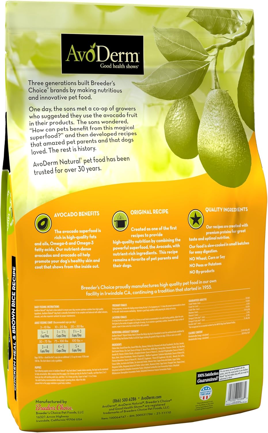 Give Your Dog A Meal They Will Look Forward To Everyday For Breakfast And Dinner. Avoderm Natural Original Chicken Meal & Brown Rice Dry Dog Food Contains Premium Ingredients Specially Selected To Provide A Healthy Balanced Nutrition While Supplying A Delicious Taste Your Adult Dog Will Love - Guaranteed! Each Bag Contains The Perfect Blend Of Natural High-Quality Proteins, Vitamins, Minerals And Antioxidants To Ensure Your Companion Is Getting The Necessary Nutrition For A Healthy Life. Rest Assured Knowing Our Premier Dog Food Is Natural With Added Vitamins And Minerals, Containing No Meat-By-Products, No Artificial Flavoring, And No Artificial Colors. Additionally, Avoderm Natural Dog Food Will Help Keep Your Dog'S Coat Healthy And Shiny All Year Round. High Quality Protein And Omega Rich Recipes Provide The Necessary Support For Healthy Skin And Coat, Even For Dogs With Sensitive Skin. The Right Nutrients In The Right Proportions Are Indispensable To Keeping Your Dog'S Skin Healthy. With Omega-Rich Avocado As One Of Our Key Ingredients, Your Dog Will Get A Mouth Full Of Vitamins, Minerals And Antioxidants With Every Bite. Avoderm Adult Chicken Meal & Brown Rice Dry Dog Food Is Crafted For All Breeds, Large Or Small. The Dry Food Is Pressure Cooked To Ensure Your Dog Receives The Optimum Nutrition And Energy Need To Keep Your Companion Active And Strong. Serve Your Dog Our Adult Chicken Meal Formula And Notice The Difference, From The Inside Out