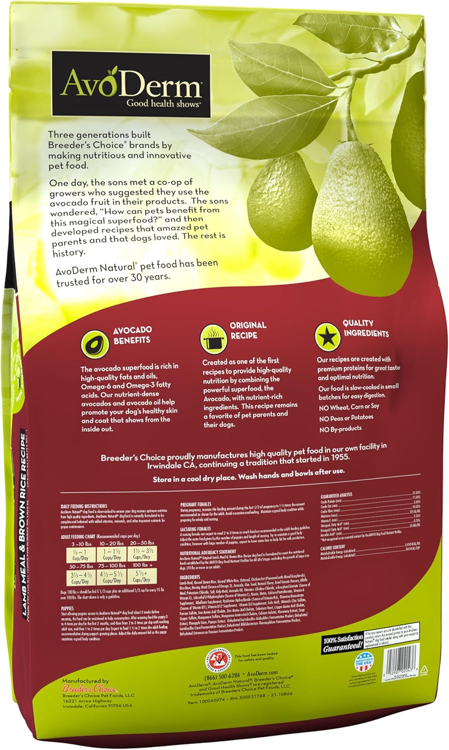 Dogs Show Love And Enthusiasm At Any Time Of Day Or Night. But At Meal Time In Particular, Your Pet'S Joy Truly Comes Out In Full Force. Packed With An Optimal Balance Of Flavor And Nutrients, AvodermĀ® Original Lamb Meal & Brown Rice Recipe Dry Dog Food Helps Your Pet'S Coat Shine Just As Brightly As Their Smiles. Avocados Are A Key Source Of The Incredible Taste And Nutritional Value Of Avoderm NaturalĀ® Dog Food Products. Much Like Meals For Adult Humans, Each Hearty Bite Of This Food Contains A Tasty Mix Of Different Nutritious Ingredients And Flavors. Your Pet Can Get All Of The Nutrients They Need In A Natural Food With Added Vitamins And Minerals. AvodermĀ® Original Lamb Meal & Brown Rice Recipe Is An Appetizing Combination Of Protein, Minerals, Healthy Fats, And Other Key Nutrients For Optimum Pet Health. With A Tasty Scoop Of Our Original Lamb Meal & Brown Rice Recipe In Their Food Bowl, Your Dog'S Love For Mealtime Is Sure To Grow - And You'Ll Love That Your Dog Is Getting High Quality And Nutritious Meal!