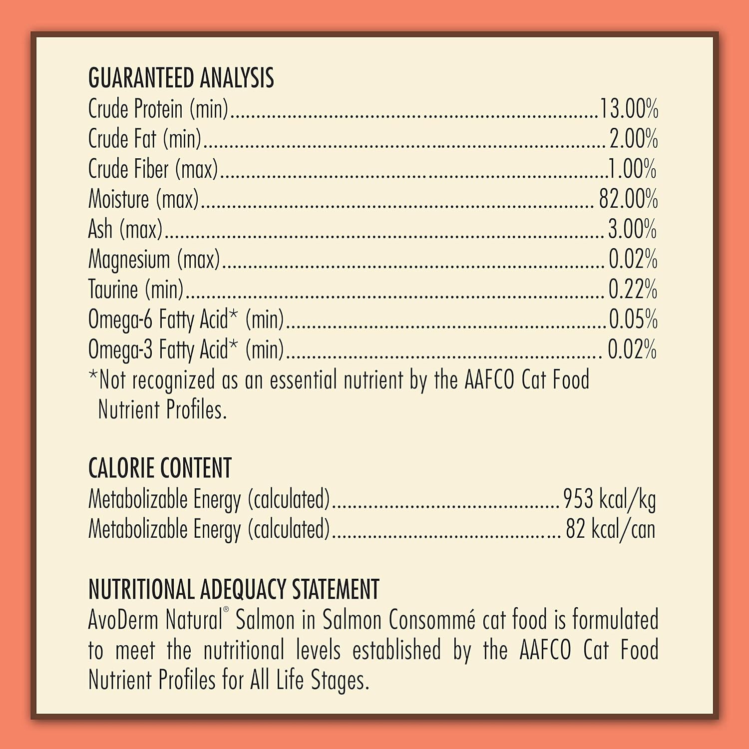 Avoderm Wild By Nature Salmon In Salmon Consommé Is Made With Wild Caught Fish And Is Grain Free Providing Healthy Balanced Nutrition For Your Cat. High Quality Ingredients Ensure That You Are Providing The Optimum Nutrition Your Pet Needs. Avoderm Wild By Nature Was Created For The Complete Health Of Your Cat. Carefully Formulated For The Everyday Health Needs For Today'S Cats, Avoderm Starts With Premium Protein Sources In Delicious Combinations To Satisfy Even The Finicky Cat. Avoderm Wild By Nature Has Vitamins, Minerals, And Antioxidant Nutrients To Help Support Your Cat'S Immune Function. Avoderm Wild By Nature Is Formulated To Be Rich In High Quality Fats And Oils With A Balanced Omega-6 To Omega-3 Fatty Acid Ratio. The Right Nutrients In The Right Proportions Are Indispensable To Keeping Your Cat'S Skin Healthy. Sometimes Shortages Or Excesses Of Specific Nutrients Can Lead To Thin, Rough Coats. Avocado And Avocado Oil Can Help Support The Skin And Coat From The Inside Out For The Protection Your Pet Needs