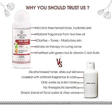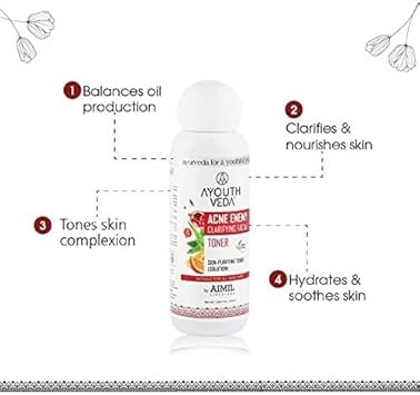 BrandAYOUTHVEDA Item FormLiquid Skin TypeAll Product BenefitsHydrating,Soothing,Purifying,Freshening ScentPomegranate,Peppermint Item Volume100 Millilitres Item Weight100 Grams Active IngredientsGarcina,Package Content: 1 clarifying facial toner; 100 ml Herbal toner enriched with botanical extracts, hydrating distillates & soothing peppermint. All weather, non- greasy, non- irritant form and developed for acne prone skin,Fortified with rose water & vitamin c rich fruit distillates which is Suitable for all skin types. Rich in tannins from pomegranates which opens & decongest pores instantly leaves skin refreshed with peppermint