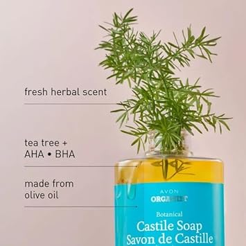 About this item Gentle Cleansing Formula: Made with olive oil-based soap, this Castile soap provides a mild yet effective cleanse, perfect for daily use. Tea Tree Infused: Enriched with tea tree to leave your skin feeling fresh and clean after every wash. Vegan & Low-pH: Crafted with a vegan-friendly formula that maintains a balanced pH for a refreshing cleanse. Free from Harsh Ingredients: Formulated without parabens, silicone oil, or sulfates, making it a great choice for those seeking a simple and effective wash. Versatile Use: Ideal for both face and body, offering a clean and refreshed feeling with every use. See more product details,Gentle Cleansing Formula: Made with olive oil-based soap, this Castile soap provides a mild yet effective cleanse, perfect for daily use,Tea Tree Infused: Enriched with tea tree to leave your skin feeling fresh and clean after every wash,Vegan & Low-pH: Crafted with a vegan-friendly formula that maintains a balanced pH for a refreshing cleanse,Free from Harsh Ingredients: Formulated without parabens, silicone oil, or sulfates, making it a great choice for those seeking a simple and effective wash,Versatile Use: Ideal for both face and body, offering a clean and refreshed feeling with every use