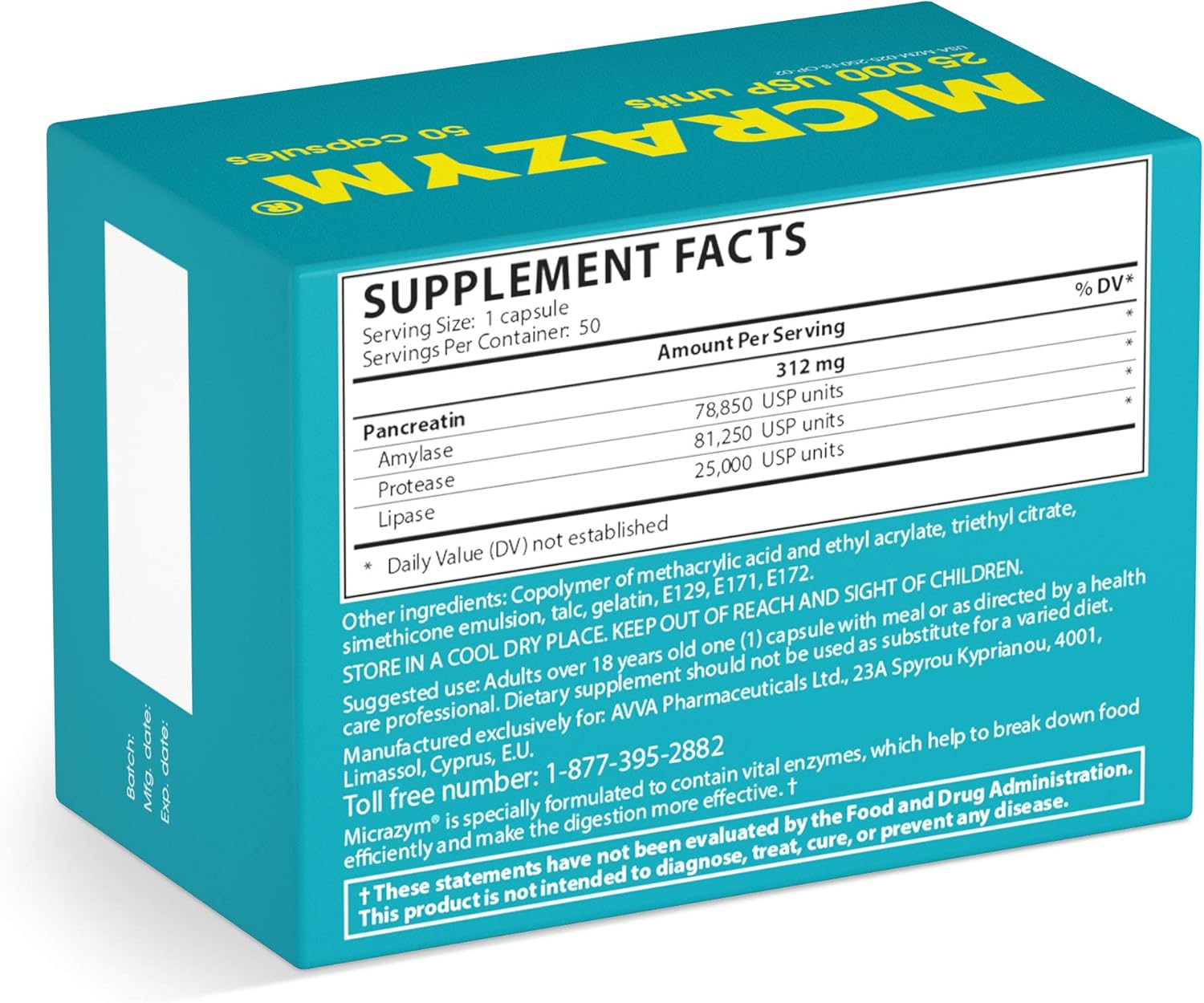 ULTRA high-strength formula: 25,000 USP units of Micrazym digestive enzyme supplements containing lipase, protease, and amylase to help break down fats / lipids, proteins, and carbohydrates