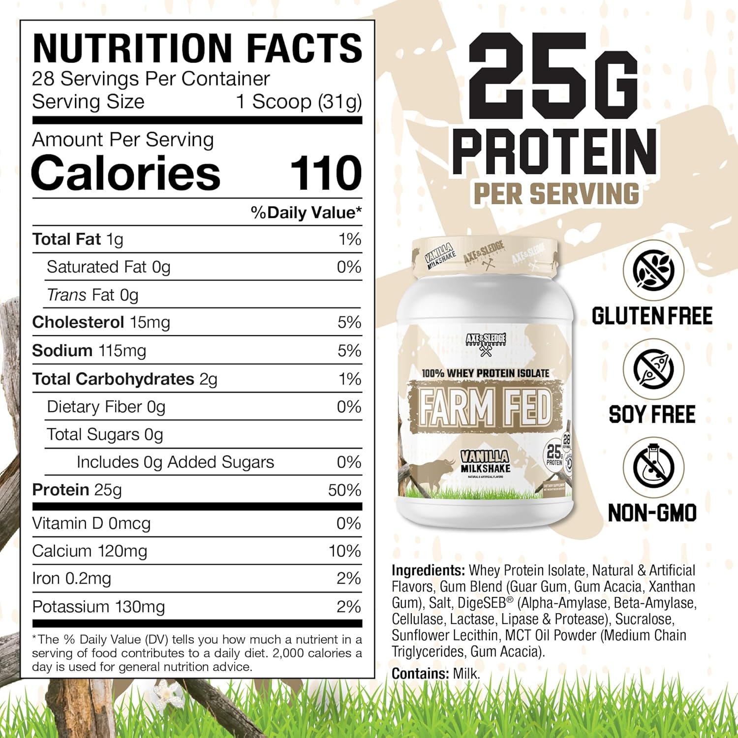 Axe & Sledge Farm Fed 100% Whey Protein Isolate offers a premium protein source that supports muscle growth and recovery, delivering 25g of protein per serving from whey isolate, known for its rapid absorption. With only 1g of fat, 2g of carbs, and 1g of sugar, it’s the perfect choice for those looking to maintain a lean physique while hitting their protein goals. Formulated with Digeseb digestive enzymes, it ensures superior nutrient absorption and reduces bloating, making it ideal for those seeking efficient digestion and gut health. Whether you're an athlete or just beginning your fitness journey, this non-GMO, soy-free protein is packed with essential BCAAs and EAAs, providing everything you need for muscle repair and performance. Plus, with a delicious flavors, Farm Fed makes it easier and more enjoyable to fuel your body and take your gains to the next level,PURE PROTEIN POWER: Farm Fed delivers 25g of top-tier whey protein isolate per serving, giving you the purest, fastest-digesting protein for muscle growth and recovery. It’s lean, mean, and packed with the essential nutrients your body craves,ENHANCED ABSORPTION: We’ve added 100mg of Digeseb digestive enzymes to help your body absorb every gram of protein. Say goodbye to bloating and discomfort and hello to superior nutrient absorption and gut health!,LEAN, CLEAN & MEAN: With only 1g of fat, 2g of carbs, and 1g of sugar per serving, Farm Fed is the perfect choice for anyone looking to build muscle while keeping their macros in check. Low fat, low sugar, high performance – that’s the Axe & Sledge way,MADE FOR EVERYONE: Whether you’re a seasoned athlete or just starting your fitness journey, Farm Fed’s 100% whey protein isolate is your ideal partner. Non-GMO, naturally rich in BCAAs & EAAs – it’s designed for maximum performance in every scoop,GOURMET FLAVORS THAT ROCK: Who says protein has to taste bland Farm Fed comes in several mouth-watering flavors to satisfy your cravings and make hitting your daily protein goals an absolute treat. Take your gains to the next level, one scoop at a time!