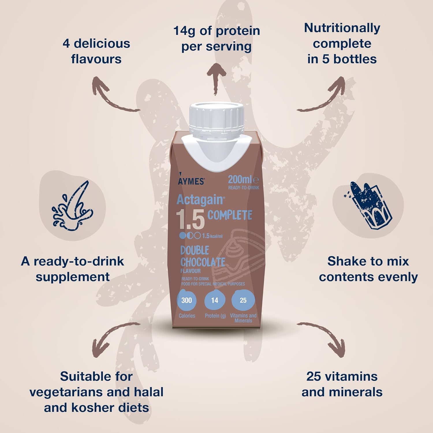 Aymes - Actagain 1.5 Complete - Double Chocolate - 24 X 200Ml Ready-To-Drink Bottles - Gluten Free & Vegetarian - Suitable For Adults And Children Aged 3+