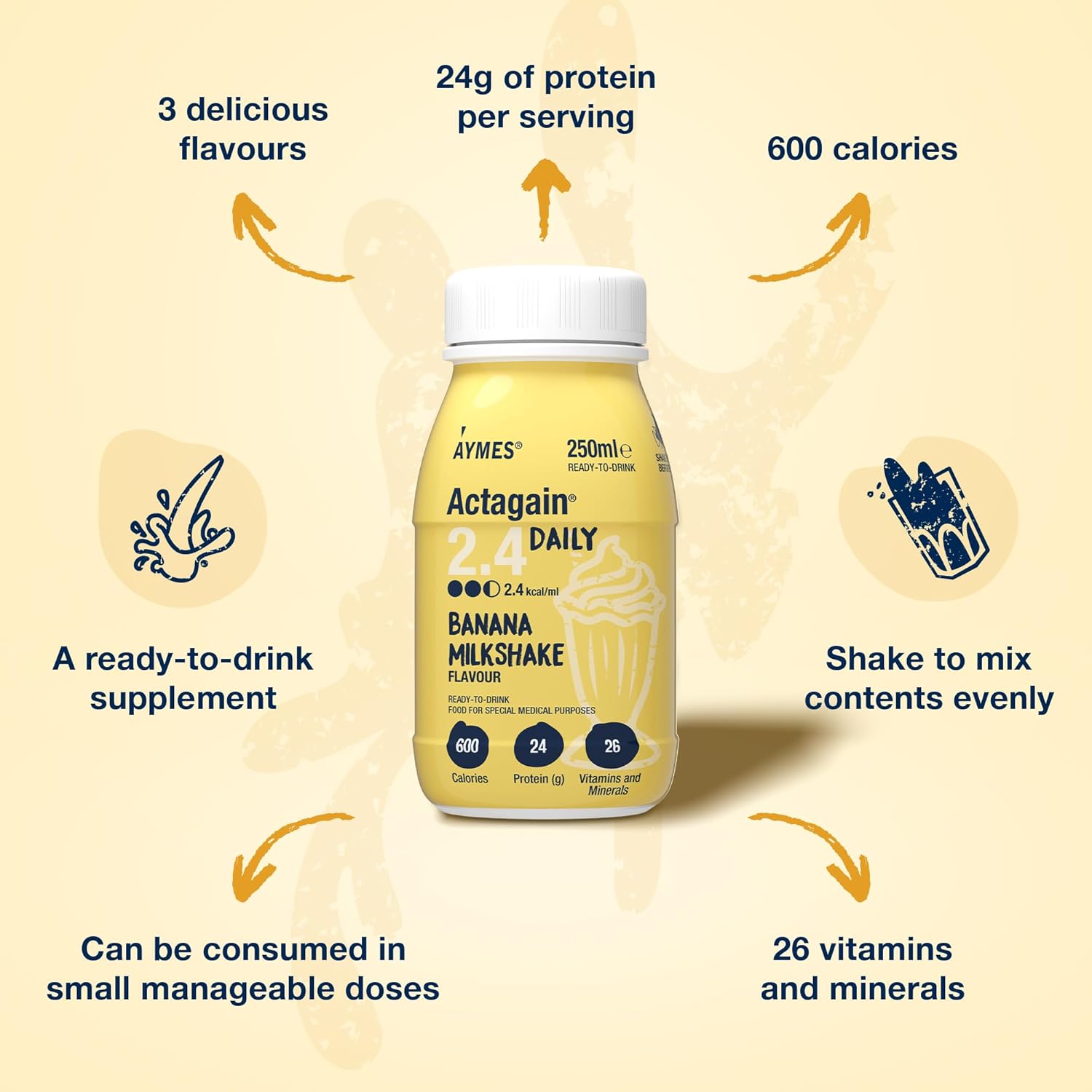 Product description Actagain 2.4 Daily is a ready-to-drink, high-energy nutritional product with an energy density of 2.4 kcal/ml. Each 250ml bottle provides 600 kcal, 24g of protein, and a blend of essential vitamins and minerals. It can be consumed in smaller portions throughout the day if preferred. If not consumed immediately, refrigerate and use within 24 hours. This product is suitable for adults and children aged 6 years and over. It is gluten free and comes in compact, easy-to-carry packaging that uses 57% less plastic compared to traditional 125ml formatsāhelping to reduce packaging waste. Ingredients Water, Glucose syrup, Milk proteins, Vegetable Oils (Rapeseed, Sunflower), Maltodextrin, Sucrose, Natural banana flavour, Minerals (Mineral premix (Chromium chloride, Sodium molybdate, Potassium iodide, Copper gluconate, Sodium selenite, Manganese sulphate), Sodium citrate, Sodium hydrogen phosphate, Potassium citrate, Potassium chloride, Potassium hydrogen phosphate, Magnesium citrate), Emulsifiers (Mono and diglycerides of fatty acids, Sunflower lecithin), Colour: natural carotene, Vitamins (Vitamin premix (Vitamin A, Niacin, Biotin, Vitamin D, Vitamin B12, Vitamin B6, Vitamin K1, Vitamin B1, Vitamin B2, Vitamin E, Pantothenic acid, Folic Acid), Sodium ascorbate), Zinc sulphate, Choline chloride, Acidity regulator: potassium hydroxide, Ferrous sulphate,HIGH ENERGY AND CONVENIENT: Actagain 2.4 Daily is a ready-to-drink nutritional product with a high energy density of 2.4 kcal/ml. Each 250ml bottle provides 600 kcal, 24g of protein, and 26 essential vitamins and minerals, offering a convenient option for individuals looking to increase their daily energy and nutrient intake,CONVENIENT FORMAT: Each 250ml bottle of Actagain 2.4 Daily contains the equivalent of two 125ml servings, allowing flexibility in how it is consumed. The compact, easy-to-carry packaging is designed with sustainability in mind, using 57% less plastic to help reduce waste,FLEXIBLE CONSUMPTION: Actagain 2.4 Daily is not only designed for flexibility but also to improve user compliance. One 250ml serving can be consumed in shot-style doses making it easier to incorporate into your daily routine,EASY TO INCLUDE IN YOUR DIET: To enjoy Actagain 2.4 Daily at its best, refrigerate the bottle before drinking for a cooler, more refreshing taste. Shake the bottle thoroughly to ensure even mixing, then twist off the cap to open. You can drink it straight from the bottle or pour it into a glass. Once opened, reseal the bottle and store it in the fridge, ensuring itās consumed within 24 hours to maintain freshness,EXPERTISE, INNOVATION AND SUSTAINABILITY: Backed by over 100 years of combined experience, we are committed to developing reliable, cost-effective nutritional products. Sustainability drives everything we do, from using certified ingredients to cutting packaging waste. As a proud B-Corp-certified company, weāre committed to making a lasting impact, on both peopleās lives and the planet