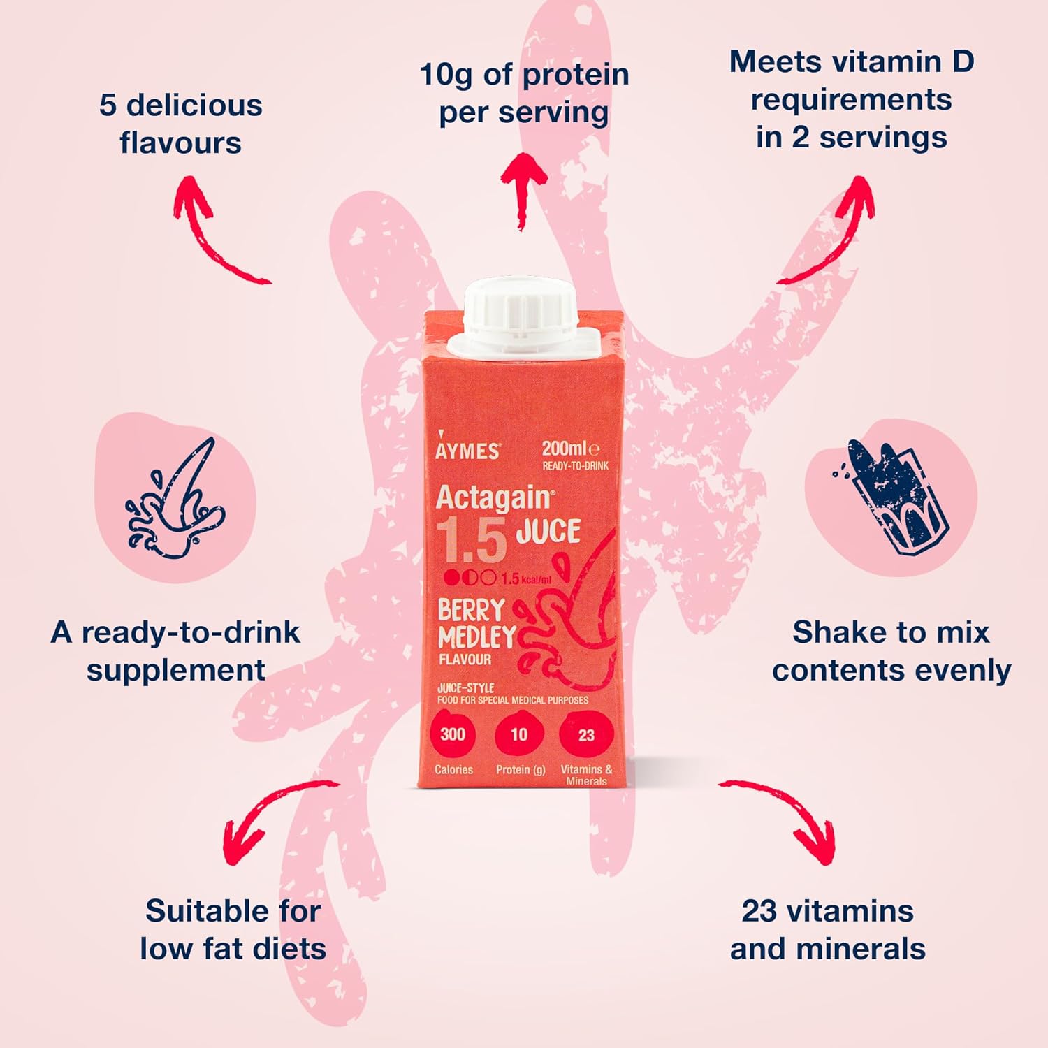 Aymes Actagain Juce - Juice-Style Nutritional Drink - Berry Medley - 24 X 200Ml Cartons - Gluten Free & Fat Free - Suitable For Adults And Children Aged 6+