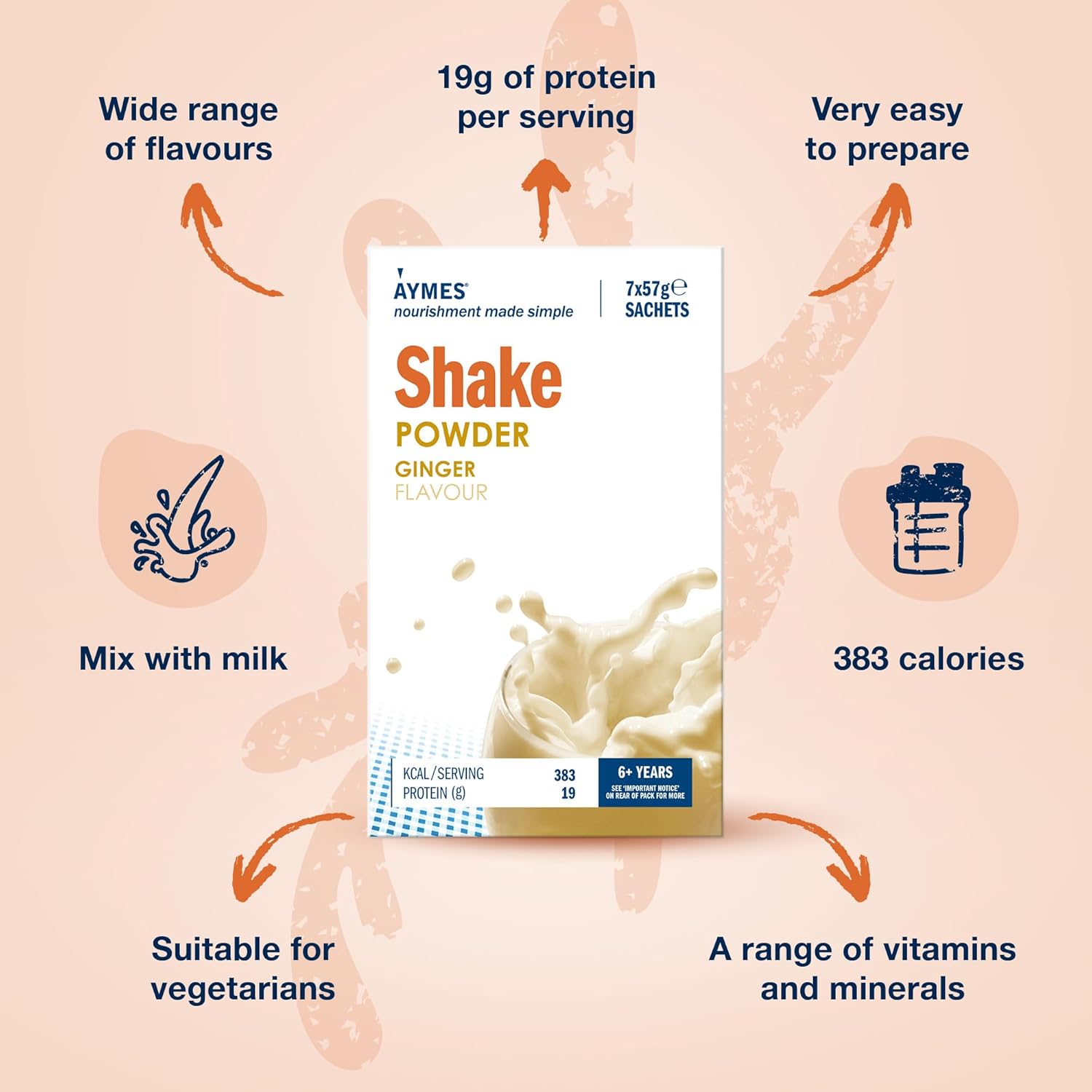 Product description AYMES Shake is a milkshake-style nutritional supplement developed to complement a balanced diet. With a wide selection of flavours - including a unique ginger option - each serving provides 19g of protein, essential vitamins and minerals, and 379–383 kcal depending on flavour. The formula is gluten free, vegetarian, and suitable for halal and kosher diets. Simply mix with milk, shake well, and enjoy. If not consumed immediately, refrigerate and use within 24 hours. AYMES Shake is designed for adults and is also suitable for children aged 3 years and over. Ingredients Skimmed Milk Powder (46%), Dried Glucose Syrup, Sugar, Palm Oil, Milk Protein Concentrate,Natural Flavourings, Maltodextrin, Ginger, Caramelised Sugar Syrup, Vitamin & MineralPremix (Potassium Dihydrogen Phosphate, Sodium Ascorbate, Vitamin E, Ferrous Sulphate,Niacin, Zinc Sulphate, Vitamin A, Pantothenic Acid, Vitamin D, Biotin, Vitamin B6, Folic Acid,Manganese Sulphate, Thiamin, Potassium Iodide, Copper Sulphate, Vitamin K, Vitamin B12,Sodium Selenite, Riboflavins, Chromium Chloride, Sodium Molybdate), Magnesium Sulphate,Emulsifier: Soya Lecithin Skimmed Milk Powder (46%), Dried Glucose Syrup, Sugar, Palm Oil, Milk Protein Concentrate,Natural Flavourings, Maltodextrin, Ginger, Caramelised Sugar Syrup, Vitamin & MineralPremix (Potassium Dihydrogen Phosphate, Sodium Ascorbate, Vitamin E, Ferrous Sulphate,Niacin, Zinc Sulphate, Vitamin A, Pantothenic Acid, Vitamin D, Biotin, Vitamin B6, Folic Acid,Manganese Sulphate, Thiamin, Potassium Iodide, Copper Sulphate, Vitamin K, Vitamin B12,Sodium Selenite, Riboflavins, Chromium Chloride, Sodium Molybdate), Magnesium Sulphate,Emulsifier: Soya Lecithin Skimmed Milk Powder (46%), Dried Glucose Syrup, Sugar, Palm Oil, Milk Protein Concentrate,Natural Flavourings, Maltodextrin, Ginger, Caramelised Sugar Syrup, Vitamin & MineralPremix (Potassium Dihydrogen Phosphate, Sodium Ascorbate, Vitamin E, Ferrous Sulphate,Niacin, Zinc Sulphate, Vitamin A, Pantothenic Acid, Vitamin D, Biotin, Vitamin B6, Folic Acid,Manganese Sulphate, Thiamin, Potassium Iodide, Copper Sulphate, Vitamin K, Vitamin B12,Sodium Selenite, Riboflavins, Chromium Chloride, Sodium Molybdate), Magnesium Sulphate,Emulsifier: Soya Lecithin Skimmed Milk Powder (46%), Dried Glucose Syrup, Sugar, Palm Oil, Milk Protein Concentrate,Natural Flavourings, Maltodextrin, Ginger, Caramelised Sugar Syrup, Vitamin & MineralPremix (Potassium Dihydrogen Phosphate, Sodium Ascorbate, Vitamin E, Ferrous Sulphate,Niacin, Zinc Sulphate, Vitamin A, Pantothenic Acid, Vitamin D, Biotin, Vitamin B6, Folic Acid,Manganese Sulphate, Thiamin, Potassium Iodide, Copper Sulphate, Vitamin K, Vitamin B12,Sodium Selenite, Riboflavins, Chromium Chloride, Sodium Molybdate), Magnesium Sulphate,Emulsifier: Soya Lecithin Skimmed Milk Powder (46%), Dried Glucose Syrup, Sugar, Palm Oil, Milk Protein Concentrate,Natural Flavourings, Maltodextrin, Ginger, Caramelised Sugar Syrup, Vitamin & MineralPremix (Potassium Dihydrogen Phosphate, Sodium Ascorbate, Vitamin E, Ferrous Sulphate,Niacin, Zinc Sulphate, Vitamin A, Pantothenic Acid, Vitamin D, Biotin, Vitamin B6, Folic Acid,Manganese Sulphate, Thiamin, Potassium Iodide, Copper Sulphate, Vitamin K, Vitamin B12,Sodium Selenite, Riboflavins, Chromium Chloride, Sodium Molybdate), Magnesium Sulphate,Emulsifier: Soya Lecithin P.when('A').execute(function(A) { A.on('a:expander:toggle_description:toggle:collapse', function(data) { window.scroll(0, data.expander.$expander[0].offsetTop-100); }); }); Directions Shake Well See more,NUTRIENT-RICH & CONVENIENT: AYMES Shake is a high-protein, milkshake-style nutritional drink designed to complement a balanced diet. Each 200ml serving provides 19g of protein, essential vitamins and minerals, and 379–383 kcal (depending on flavour), making it a convenient option for individuals with increased nutritional needs,WIDE FLAVOUR SELECTION: With a wide range of flavours on offer, from classic favourites to our unique ginger flavour, there's something for everyone. Just mix with milk for a smooth, great-tasting drink that’s easy to prepare and enjoy,DIETARY INCLUSIVE: Each high-protein serving contains a blend of vitamins and minerals to complement daily nutritional intake as part of a balanced diet. AYMES Shake is gluten free, vegetarian, and suitable for halal and kosher diets, making it a versatile option for a variety of dietary preferences,EASY TO PREPARE: Simply tear open a sachet, pour the powder into a shaker, add the recommended amount of milk, and shake well until smooth. For best taste, enjoy immediately, or store in the fridge and consume within 24 hours. AYMES Shake offers a convenient way to enjoy a nutrient-rich drink with minimal preparation,EXPERTISE, INNOVATION AND SUSTAINABILITY: Backed by over 100 years of combined experience, we are committed to developing reliable, cost-effective nutritional products. Sustainability drives everything we do, from using certified ingredients to cutting packaging waste. As a proud B-Corp-certified company, we’re committed to making a lasting impact, on both people’s lives and the planet