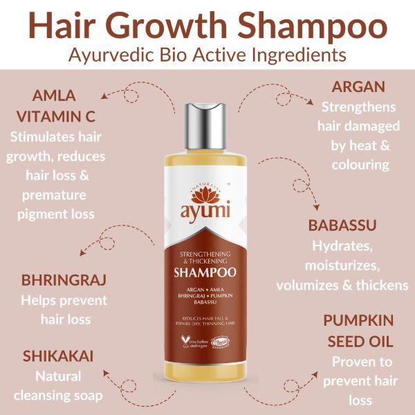 Product Information:Looking for a sandalwood shampoo that will nourish your hair and scalp while also stimulating hair growth?Look no further than Ayumi Argan Oil & Sandalwood Shampoo for hair growth!,Features:This shampoo is specifically formulated for frequent use on all hair types, particularly for thin and weak hair,Product Specification:Contains: Aqua, Ammonium Lauryl Sulfate, Coco-Glucoside, Decyl Glucoside, Cocamidopropyl Betaine, Acrylates Copolymer, Parfum, Glyceryl Oleate, Quaternium-80, Glycerin, Eclipta Prostrata (Bhringraj) Extract, Phyllanthus Emblica (Amla) Extract, Sapindus Trifoliatus (Aritha) Fruit Extract, Argania Spinosa (Argan) Kernel Oil, Cucurbita Pepo (Pumpkin) Seed Oil, Orbignya Oleifera (Babassu) Seed Oil, Acacia Concinna (Shikakai) Fruit Extract, Polyquaternium-11, Panthenol (Vitamin B5), Jasminum Grandiflorum (Jasmine) Flower Extract, Cyperus Rotundus (Nutgrass) Root Extract, Santalum Spicata (Sandalwood) Oil, Piper Nigrum (Pepper) Seed Extract, Zingiber Officinale (Ginger) Root Extract, Cinnamomum Zeylanicum Bark Extract, Cananga Odorata (Ylang Ylang) Flower Oil, Pogostemon Cablin (Patchouli) Leaf Oil, Lavandula Angustifolia (Lavender) Oil, Sodium Chloride, Sodium Levulinate, Citric Acid, Sodium Benzoate, Potassium Sorbate, Alpha isomethyl Ionone,Product Uses:Take a small amount of the shampoo and gently massage it into the scalp using your fingertips. Allow it to lather up using tepid water. Depending on the length of your hair, repeat the process