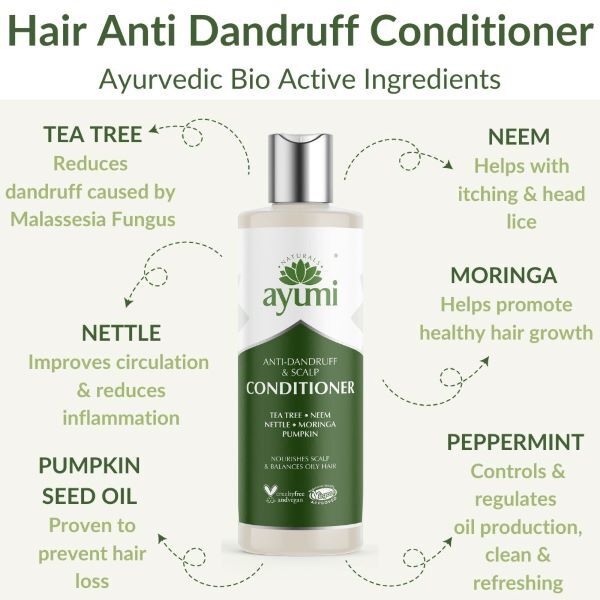 Product Information:Are you looking for a conditioner that will not only nourish and strengthen but is also an anti dandruff hair conditioner? Ayumi's Dandruff Control Conditioner + Moringa + Neem + Tea Tree is for you!,Features:Our Nettle is an all-natural ingredient with minerals, vitamins and antioxidants that boost hair health,Product Specification:Contains:,Product Uses:Apply to wet hair after shampooing, comb through and leave for 5 minutes and then rinse. A small amount can be applied to dry hair to conceal split ends and aid styling