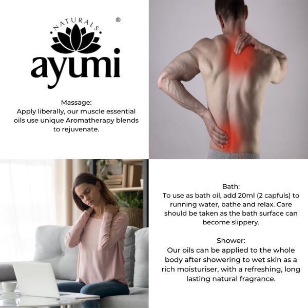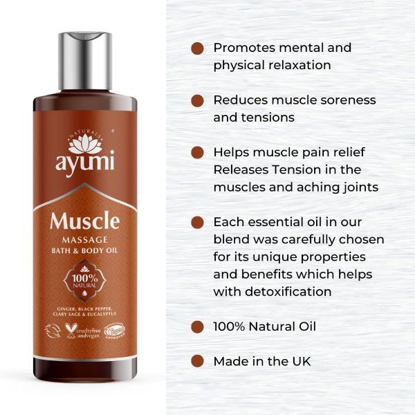 Product Information:Ayumi's Muscle Massage Oil has a significant component of giving your sore muscles instant relief,Features:Our Massage Oil for Muscle Pain: Relaxing Relief for Aching Muscles Heavy lifting, wrong sleeping positions, or simply a strenuous activity out of your routine can lead to terrible muscle aches. The pull of the muscle can be excruciatingly painful, and sometimes even a hot massage cannot work for it,Product Specification:Prunus Amygdalus Dulcis (Sweet Almond) Oil, Caprylic/Capric Triglyceride, Olea Europaea (Olive) Fruit Oil, Prunus Armeniaca (Apricot) Kernel Oil, Rosmarinus Officinalis (Rosemary) Leaf Oil, Sesamum Indicum (Sesame) Seed Oil, Zingiber Officinale (Ginger) Root Oil, Piper Nigrum (Pepper) Seed Oil, Salvia Sclarea (Clary) Oil, Eucalyptus Globulus Leaf Oil, Calendula Officinalis Flower (Marigold) Extract, Tocopherol ( Vitamin E), Citral*, Geraniol*, Limonene*, Linalool*. *Naturally derived from essential oils,Product Uses:How To Use: Massage: Apply liberally, our muscle essential oils use unique Aromatherapy blends to rejuvenate