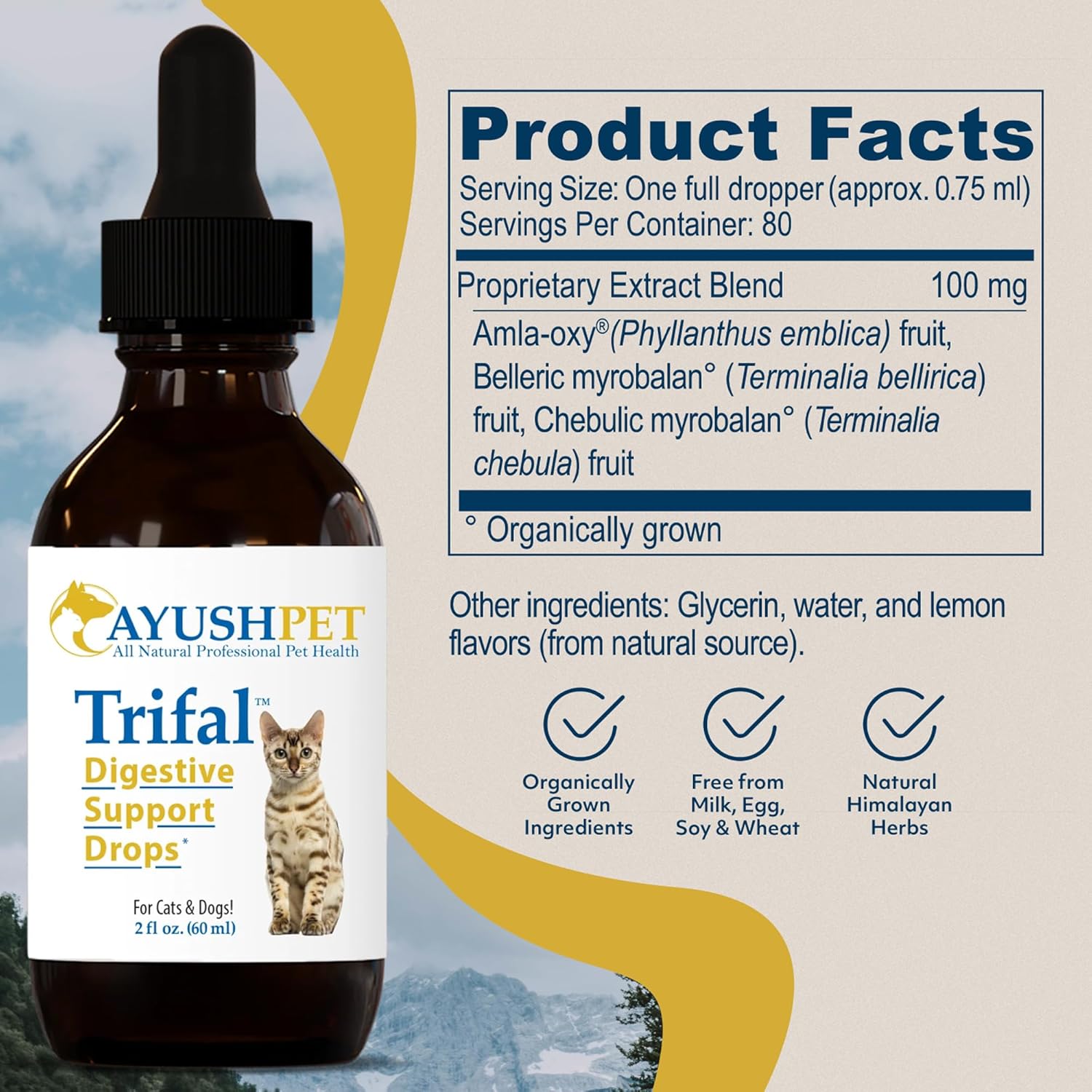About this item HOLISTIC DIGESTIVE SUPPORT: These alcohol-free drops support your petās peaceful digestion, balanced elimination, and overall wellness. WHOLE BODY SUPPLEMENT: Our liquid herbal blend is rich in antioxidants, for nose to tail health. Trifal drops can also support your petās eyesight. VET RECOMMENDED: Our supplements are used and recommended by holistic veterinarians, who focus on petsā whole-body health. They were formulated for regular use for pets of all ages and wellness needs. SEED TO SHELF INTEGRITY: Starting with herbs that are organically grown and sustainably harvested, our pet supplements are of the highest quality. We utilize proven modern technology in extracting and testing to bring you pure, effective herbal pet products. INSPIRED BY AYURVEDA: Inspired by the wisdom of Ayurveda, Ayush Pet joins this healing tradition with modern science to provide the highest-quality herbal supplements for your petās best life. See more product details,HOLISTIC DIGESTIVE SUPPORT: These alcohol-free drops support your petās peaceful digestion, balanced elimination, and overall wellness,WHOLE BODY SUPPLEMENT: Our liquid herbal blend is rich in antioxidants, for nose to tail health. Trifal drops can also support your petās eyesight,VET RECOMMENDED: Our supplements are used and recommended by holistic veterinarians, who focus on petsā whole-body health. They were formulated for regular use for pets of all ages and wellness needs,SEED TO SHELF INTEGRITY: Starting with herbs that are organically grown and sustainably harvested, our pet supplements are of the highest quality. We utilize proven modern technology in extracting and testing to bring you pure, effective herbal pet products,INSPIRED BY AYURVEDA: Inspired by the wisdom of Ayurveda, Ayush Pet joins this healing tradition with modern science to provide the highest-quality herbal supplements for your petās best life
