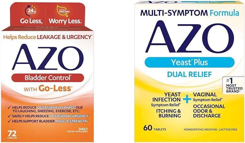 This bundle from AZO combines products to relieve bladder issues and vaginal discomfort. The AZO Bladder Control supplement has 72 capsules with a natural ingredient blend to support bladder muscle strength. It helps reduce occasional urine leakage from laughing, coughing, sneezing or exercise. The recommended usage is 1 capsule 3 times daily for the first 2 weeks, then 1 capsule twice daily. Benefits may occur within 2 weeks but can take up to 6 weeks. The AZO Yeast Plus tablets provide vaginal itching, burning and discharge relief in one easy homeopathic pill. The 60 tablets stimulate the body's defenses against imbalances causing yeast infections and vaginal issues. Together these products deliver multi-symptom relief. The bladder control capsules allow you to worry less about leaks so you can enjoy life's moments. The vaginal tablets relieve uncomfortable symptoms so you can feel like yourself again. With convenient oral dosing and quick relief, this bundle simplifies maintaining feminine and urinary health
