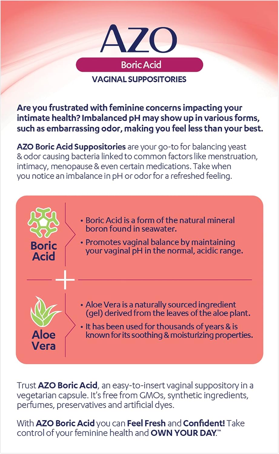 Support A Healthy Ph Balance – Azo Boric Acid Vaginal Suppositories Help You Take Control And Balance Vaginal Ph. These Vaginal Suppositories Contain Clinically Studied Boric Acid, A Form Of The Natural Mineral Boron, Which Helps Promote Balance And Maintain Vaginal Ph