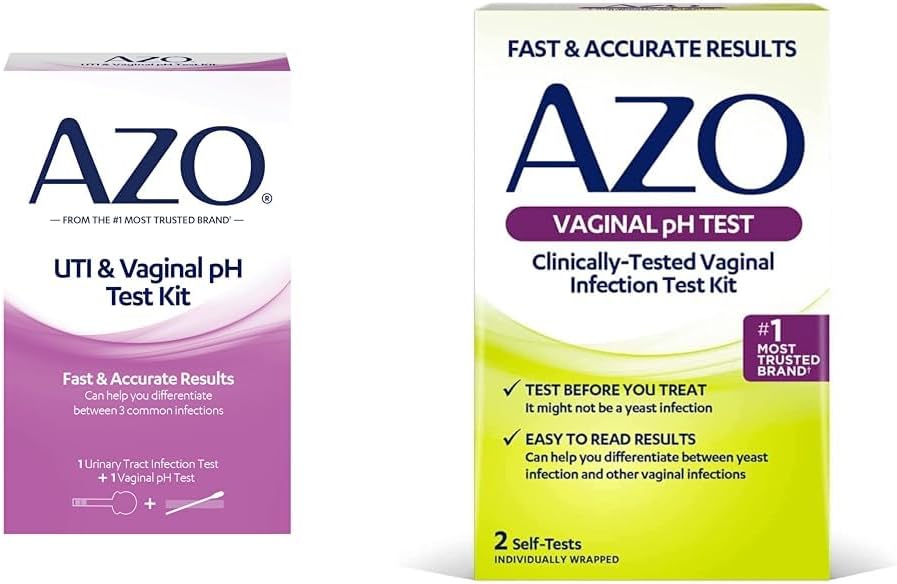 This bundle combines AZO's trusted urinary tract infection (UTI) test strips and vaginal pH test kits to help you accurately identify potential infections. The UTI test strip bundle provides one count of the UTI test strip, the same test used by many doctors to check for UTIs. It measures leukocytes and nitrites in just 2 minutes to help you reliably identify if you have a UTI. The vaginal pH test bundle includes two sealed sterile swabs and pH test strips. By testing vaginal pH, it detects potential yeast infections and bacterial vaginal infections. 50% of women incorrectly self-diagnose these infections, so this kit provides fast, accurate at-home results. Its easy-to-read chart helps you determine what type of vaginal infection you may have and appropriate next steps. With AZO's #1 most trusted brand for urinary and vaginal health, this bundle conveniently combines tests to identify both UTIs and vaginal infections quickly in the privacy of your home