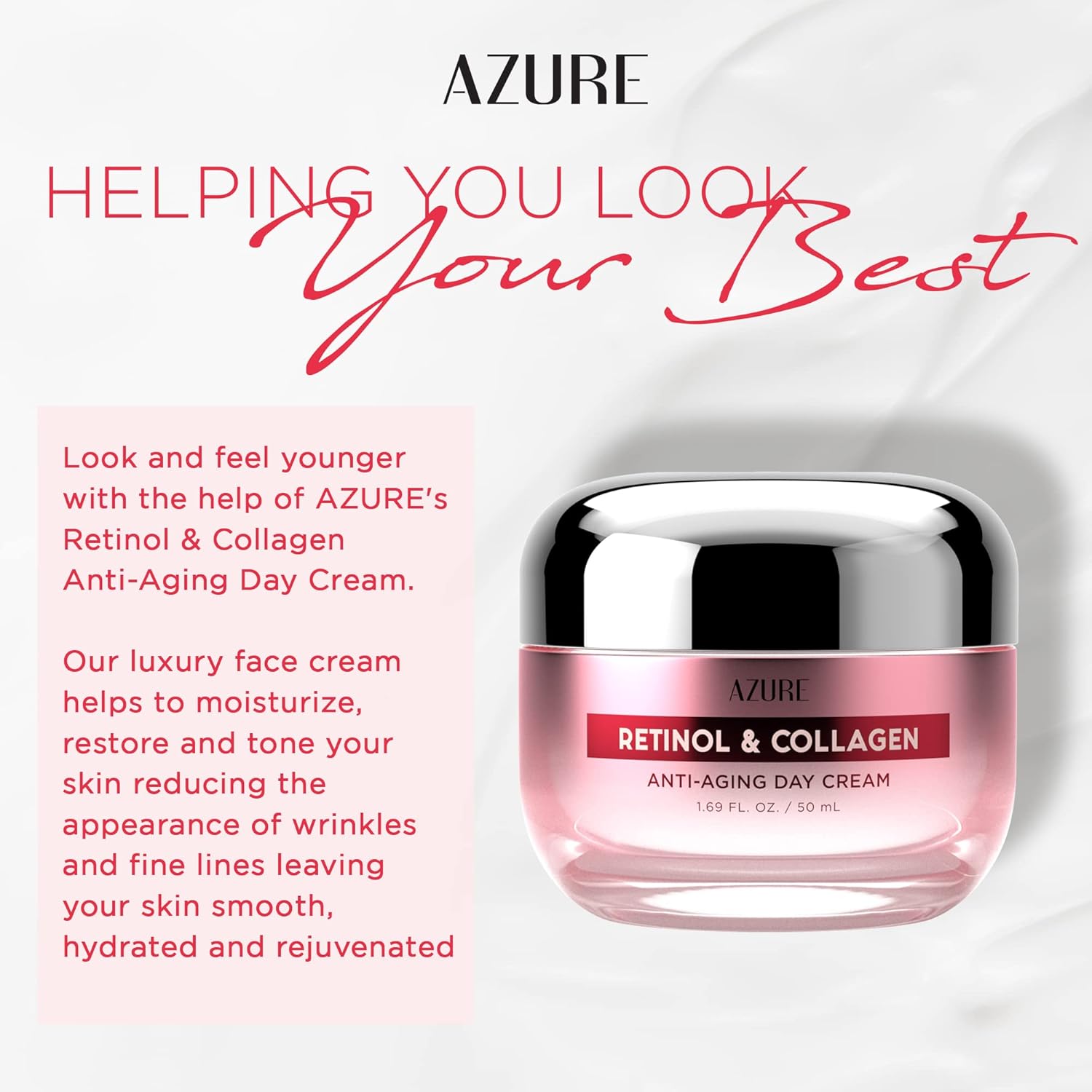 About this item ALL DAY MOISTURIZING FACE CREAM: Our long lasting hydrating face cream is specially formulated to help moisturize, smooth & rejuvenate your skin. The AZURE facial moisturizer reduces the appearance of wrinkles and fine lines, tightens, and evens the skin tone for more youthful, revitalized, and radiant skin. PREMIUM ACTIVE INGREDIENTS: Our skin care products are made from high-quality ingredients such as collagen with hyaluronic acid, which boasts anti aging properties, while aloe vera and shea butter keeps the skin moisturized. This lightweight firming face cream plumps up your skin and leaves your face dewy and glowing. EASY TO USE: Before applying the AZURE skin moisturizer, cleanse and lightly exfoliate with a face brush or soft cloth. Apply daily to the face and neck after your cleansing routine is complete. Our anti aging moisturizer is an excellent follow-up to the AZURE peel-off masks. CLEAN BEAUTY SKIN CARE: We know how important it is to be conscious about what goes on your face. That's why we've created our skin care set with clean, 95% natural, vegan, and cruelty-free ingredients. Our facial skin care products contain no parabens, phthalates, and GMOs. OUR PROMISE: We stand behind every product we make. If our products fail to live up to your expectations, you may reach out to us and we’ll make it right - no questions asked! › See more product details,ALL DAY MOISTURIZING FACE CREAM: Our long lasting hydrating face cream is specially formulated to help moisturize, smooth & rejuvenate your skin. The AZURE facial moisturizer reduces the appearance of wrinkles and fine lines, tightens, and evens the skin tone for more youthful, revitalized, and radiant skin,PREMIUM ACTIVE INGREDIENTS: Our skin care products are made from high-quality ingredients such as collagen with hyaluronic acid, which boasts anti aging properties, while aloe vera and shea butter keeps the skin moisturized. This lightweight firming face cream plumps up your skin and leaves your face dewy and glowing,EASY TO USE: Before applying the AZURE skin moisturizer, cleanse and lightly exfoliate with a face brush or soft cloth. Apply daily to the face and neck after your cleansing routine is complete. Our anti aging moisturizer is an excellent follow-up to the AZURE peel-off masks,CLEAN BEAUTY SKIN CARE: We know how important it is to be conscious about what goes on your face. That's why we've created our skin care set with clean, 95% natural, vegan, and cruelty-free ingredients. Our facial skin care products contain no parabens, phthalates, and GMOs,OUR PROMISE: We stand behind every product we make. If our products fail to live up to your expectations, you may reach out to us and we’ll make it right - no questions asked!