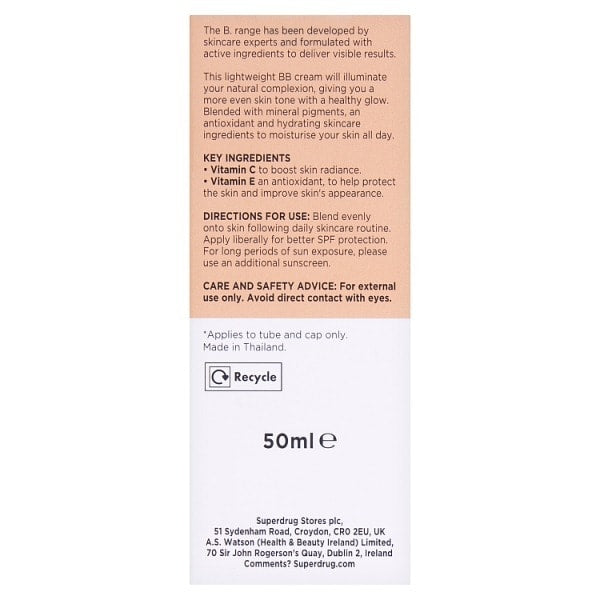 Product Information:This lightweight, illuminating BB cream will enhance your natural complexion, giving you a more even skin tone with a healthy glow. With 24 hour moisturisation and SPF 30 protection,Features:1_Brandbank,Warning or Restrictions:08182289,Product Specification:818228,Recyclable:EN