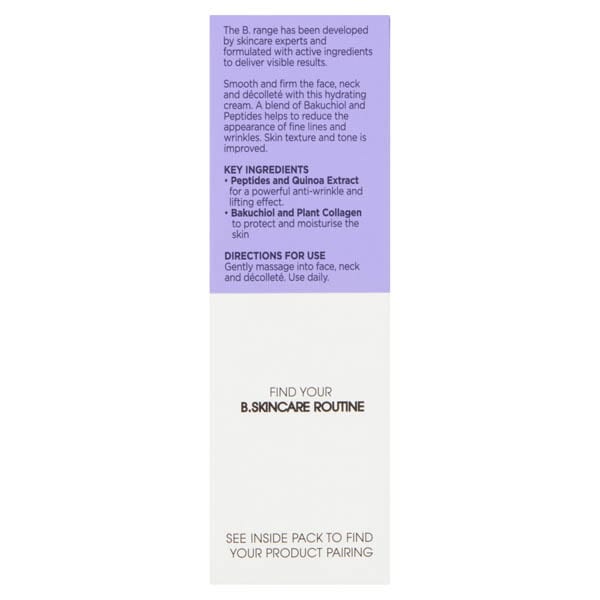 Product Information:B. Firming Face and Neck Cream smooth and firm your neck and decollete with this hydrating cream,Features:A blend of bakuchiol and peptides help to reduce the appearance of age spots, fine lines and wrinkles and plant collagen, helps to plump and firm the skin and improve the texture. With peptides and quinoa extract for a powerful anti-wrinkle and lifting effect and a combination of Plant Collagen and Bakuchiol to improve skin density and moisture level of the skin. Squalane to help retain moisture increasing skin firmness and elasticity. Suitable for vegans,Warning or Restrictions:For external use only. Do not use on broken or irritated skin. In case of irritation, discontinue use. Avoid contact with the eyes and rinse well with water immediately if product gets into them. Do not store in direct sunlight. Keep out of reach of children,Product Specification:Aqua, Hydrogenated Farnesene, Glycereth-26, Polysorbate 60, Chenopodium Quinoa Seed Extract, Propanediol, Squalane, Glycerin, Hydroxyethyl Acrylate/Sodium Acryloyldimethyl Taurate Copolymer, Caprylyl Glycol, Carbomer, Tocopheryl Acetate, Triethyl Citrate, Bakuchiol, Parfum, Xanthan Gum, Sodium Hydroxide, Benzoic Acid, Disodium EDTA, Sorbitan Isostearate, Collagen Amino Acids, Citronellol, Hydroxypropyl Cyclodextrin, Leuconostoc/Radish Root Ferment Filtrate, Sesamum Indicum Seed Oil, Limonene, Palmitoyl Tripeptide-38,Product Uses:Apply daily, in the morning, on clean dry skin. Gently massage over your neck and decollete,Recyclable:Bottle: Recycle Pump: Don't Recycle Carton: Recycle