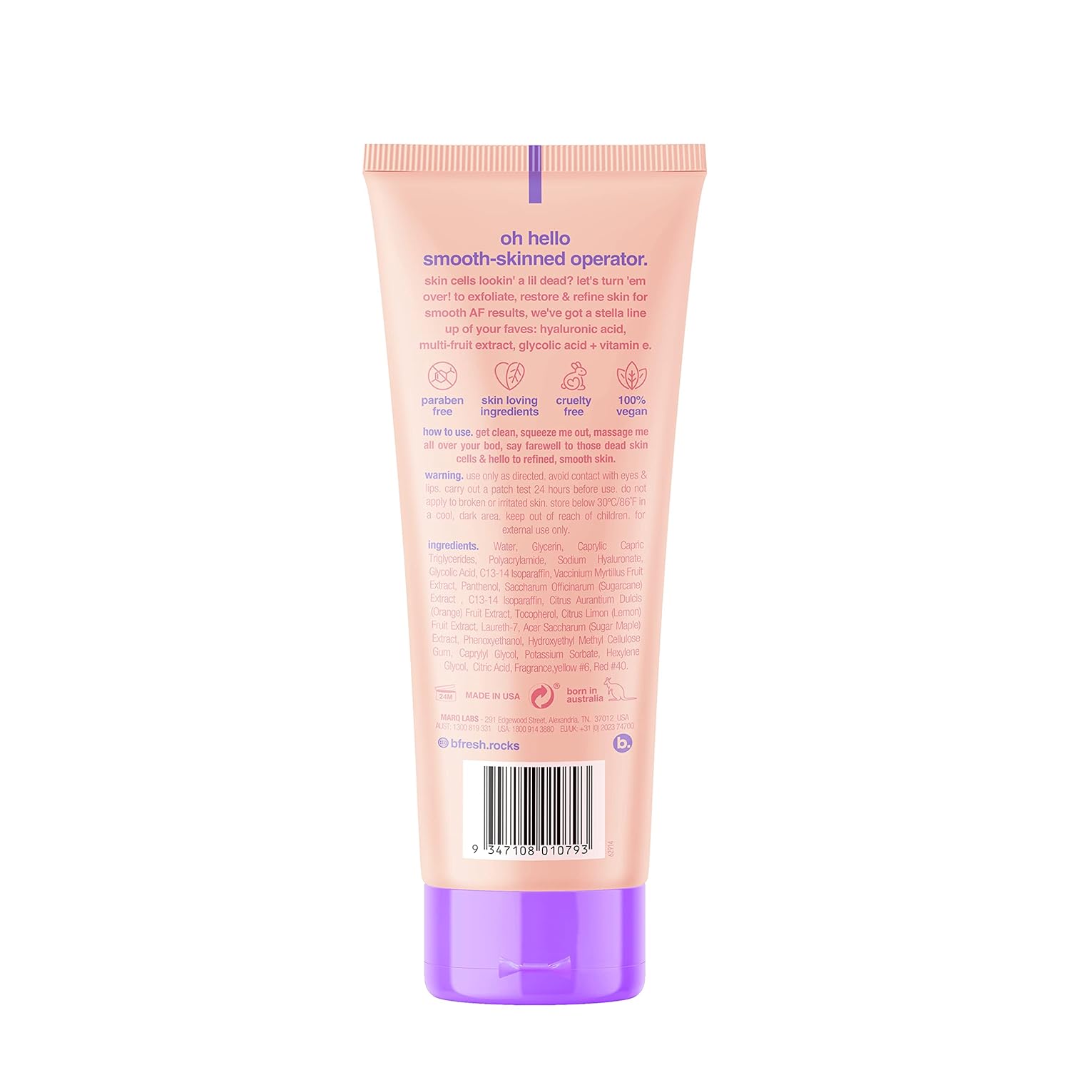 About this item multi-fruit extract + glycolic acid work to gently exfoliate, improve skin texture, fade hyperpigmentation & fine lines hyaluronic acid + vitamin e restore moisture and smooth skin i improve your overall complexion by exfoliating those dead skin cells that gotta go paraben free. cruelty free. skin loving ingredients. › See more product details,multi-fruit extract + glycolic acid work to gently exfoliate, improve skin texture, fade hyperpigmentation & fine lines,hyaluronic acid + vitamin e restore moisture and smooth skin,i improve your overall complexion by exfoliating those dead skin cells that gotta go,paraben free. cruelty free. skin loving ingredients