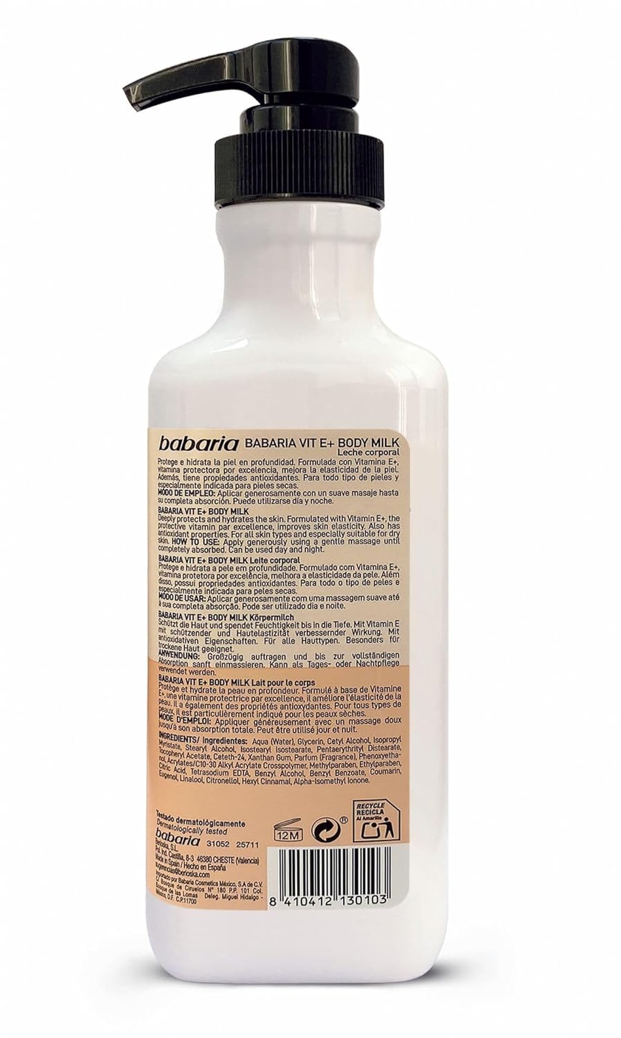 Experience the power of Babaria Vitamin E Body Milk, a revolutionary body cream for men and women. This body milk is a must-have for anyone with dry skin, as it has been specially recommended and formulated to combat this common issue. Our body cream for dry skin is designed to provide deep moisturizing action, leaving your skin feeling soft and hydrated all day long. In addition to its moisturizing properties, this body lotion also improves skin flexibility, making your skin look and feel younger,EXCEPTIONAL MOISTURIZING ACTION: This lotion for men and women offers a moisturizing effect that lasts all day. Its advanced formula ensures that moisture is locked into the skin, preventing dryness and dehydration,IMPROVES SKIN FLEXIBILITY: Enriched with Vitamin E, this body lotion for dry skin enhances skin flexibility and protects the skin from harsh elements, helping maintain a youthful appearance,STIMULATES COLLAGEN PRODUCTION: Our body lotion for women and men helps boost collagen production, contributing to the skinās structural integrity and reducing the appearance of fine lines and wrinkles,24-HOUR HYDRATION: Experience the luxury of long-lasting moisture with our body lotion for women and men. Its advanced formula ensures that your skin remains hydrated and nourished for up to 24 hours,SPECIALLY RECOMMENDED FOR SENSITIVE SKIN: Gentle enough for sensitive skin types, this body lotion for dry skin soothes and cares for delicate skin, providing essential hydration without discomfort