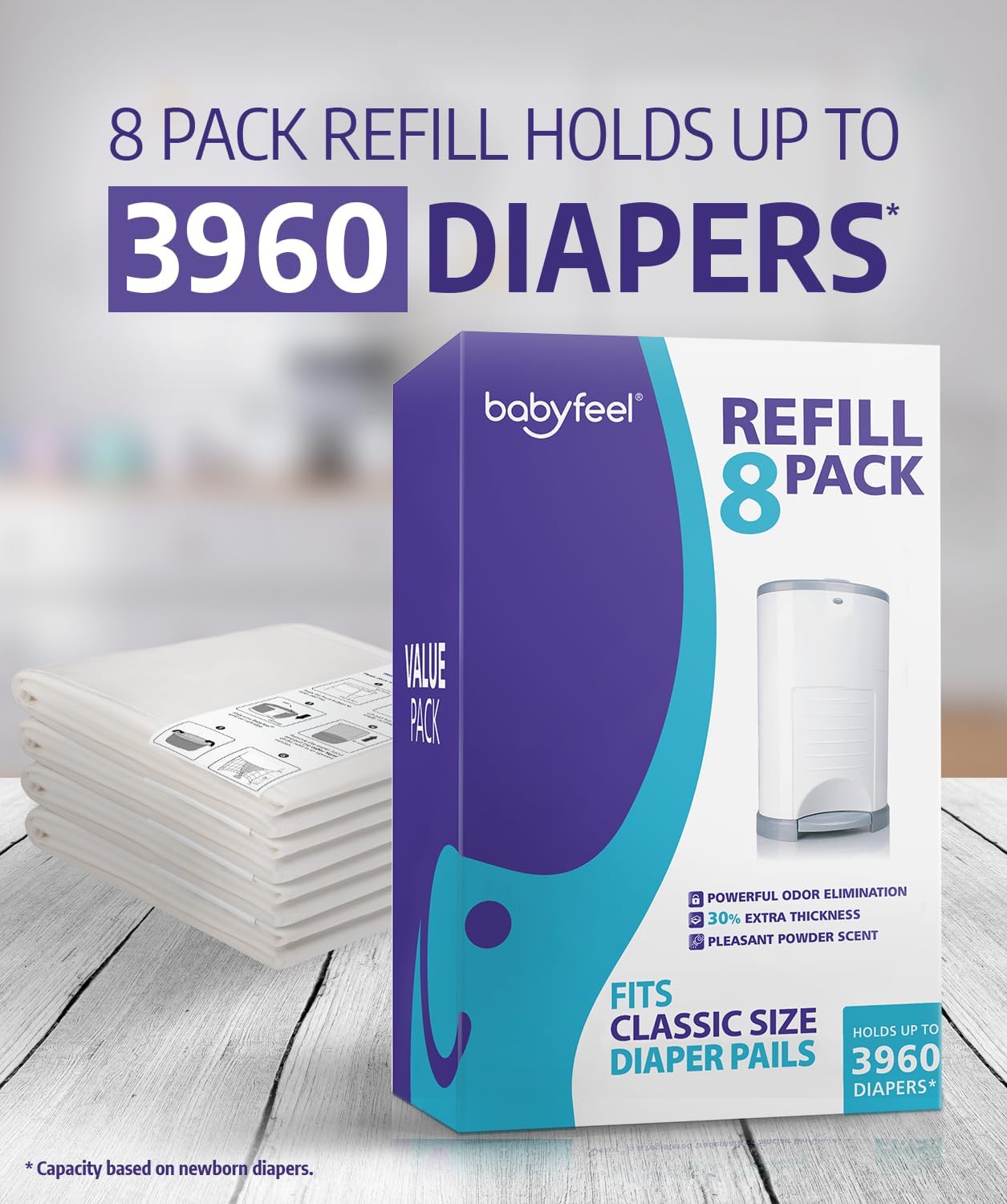 Babyfeel Refills Compatible With Dekor Classic Diaper Pails | 8 Pack | Exclusive 30% Extra Thickness | Diaper Pail Refills With Powerful Odor Elimination | Powder Scent | Holds Up To 3960 Diapers