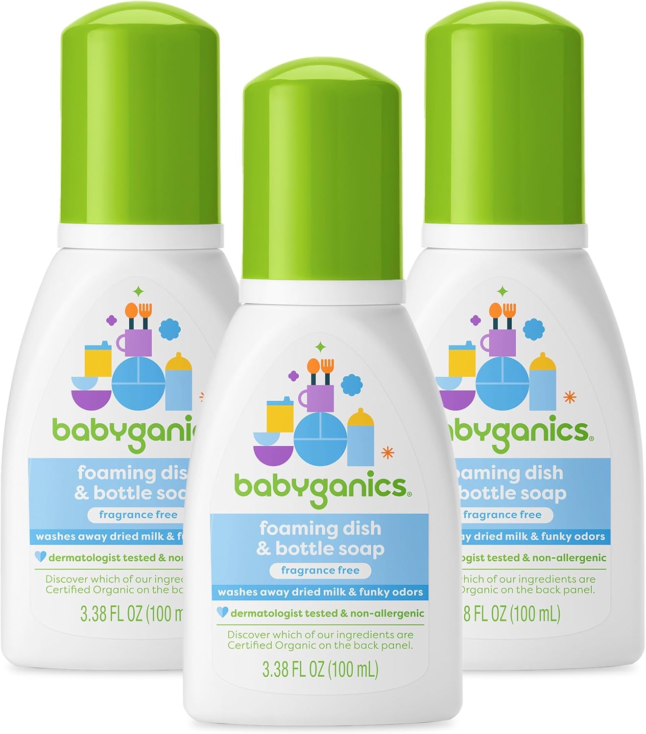 Babyganics Foaming Dish & Bottle Soap For Travel, Fragrance Free, Plant-Derived Cleaning Power, Removes Dried Milk, Packaging May Vary, 3.38 Fl Oz (Pack Of 3)