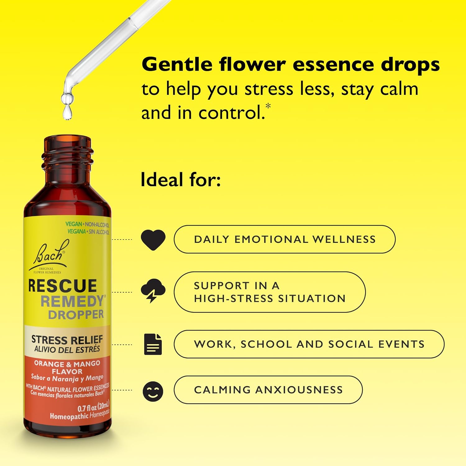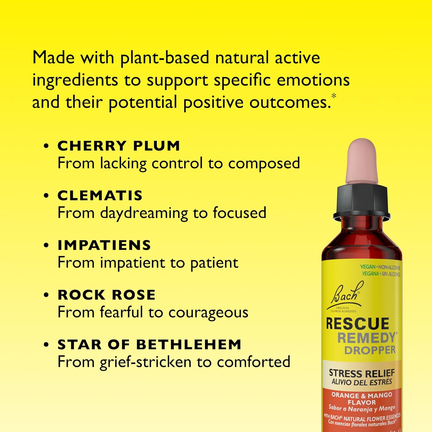 RESCUE REMEDY Dropper Orange & Mango 20ml is made with the original Rescue Remedy 5-flower essence blend that has been trusted worldwide for generations, plus a new natural orange mango flavor. Ideal for daily use, the gentle formula helps relieve feelings of everyday stress. Homeopathic formula is non-habit forming & will not interfere with other medications or supplements. Features bilingual English/Spanish packaging. Made in England. Claims are based on traditional homeopathic practice, not accepted medical evidence. Not FDA evaluated,CALM VIBES, NEW FLAVOR: The original Rescue Remedy now in a non-alcohol blend with natural orange & mango flavor,EMOTIONAL SUPPORT: Works on the emotional level to help relieve feelings of stress, restlessness and irritability,TRUSTED WORLDWIDE: Made with the doctor-developed 5-natural flower essence blend discovered by Dr. Bach in the 1930s,GENTLE FORMULA: Plant-based natural active ingredients, homeopathic, vegan. NO: Artificial ingredients, gluten, sugar,CALMING DAILY ESSENTIAL: Simply take 4 drops on the tongue or add to a beverage and sip throughout the day for calm vibes,SATISFACTION GUARANTEED: Covered by the Nelsons 45-Day Satisfaction Guarantee. Additional terms apply. See below for details